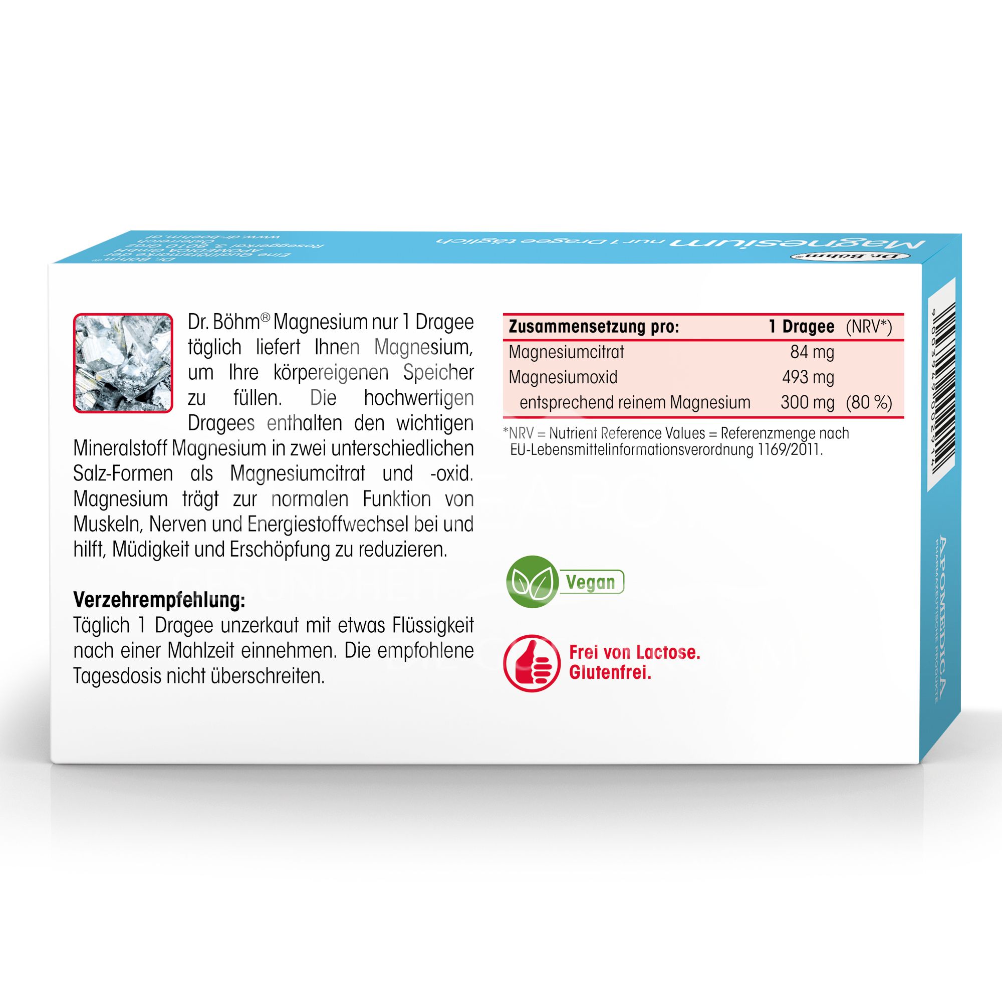 Dr. Böhm® Magnesium nur 1 x täglich Dragees sind ein Nahrungsergänzungsmittel und unterstützen Muskeln, Nerven und Energiestoffwechsel! 300 mg Magnesium zum nachhaltigen Auffüllen der Magnesium-Speicher.