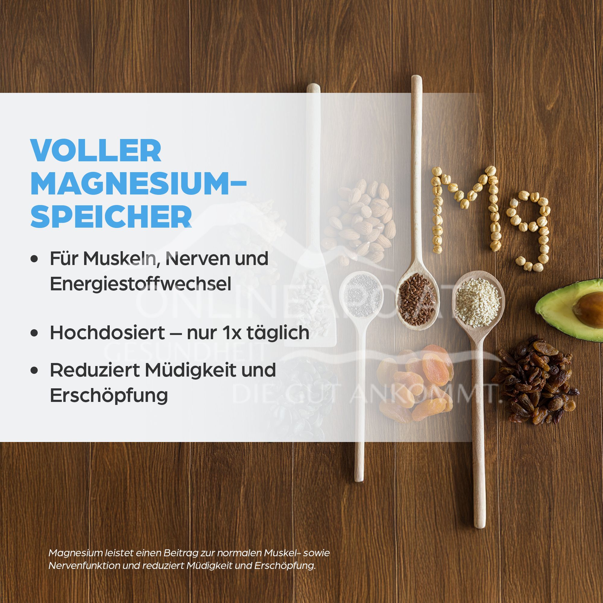Magnesium trägt zur normalen Funktion von Muskeln, Nerven und Energiestoffwechsel bei. Es unterstützt gesunde Knochen und Zähne und leistet einen wichtigen Beitrag zur Reduktion von Müdigkeit und Erschöpfung.
