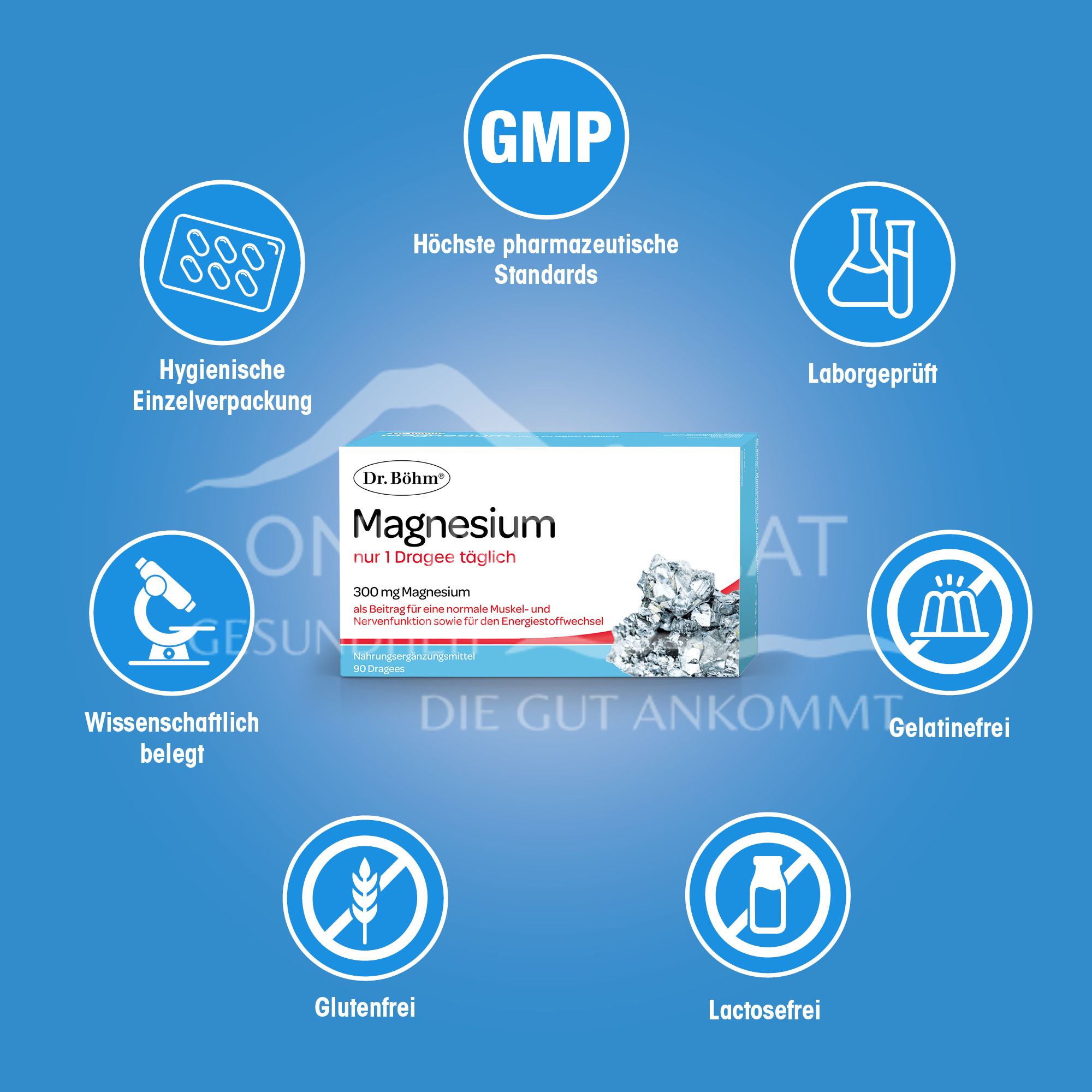 Dr. Böhm® Magnesium nur 1 x täglich wurde mit dem Ziel entwickelt, die Versorgung mit Magnesium nachhaltig und einfach zu unterstützen. Es enthält hochdosiertes Magnesium und eignet sich hervorragend dazu, die körpereigenen Magnesium-Speicher dauerhaft zu füllen. Laut ÖGE (Österreichische Gesellschaft für Ernährung) liegt der Magnesiumbedarf bei Erwachsenen bei etwa 300 mg täglich. Diesen Tagesbedarf an Magnesium decken Sie mit einem Dragee Dr. Böhm® Magnesium nur 1 x täglich ab. Großer Vorteil der magensaftresistenten Dragees: Die Magnesiumionen werden erst im Darm langsam und kontinuierlich freigesetzt. Der wertvolle Mineralstoff ist dadurch besonders gut verträglich.