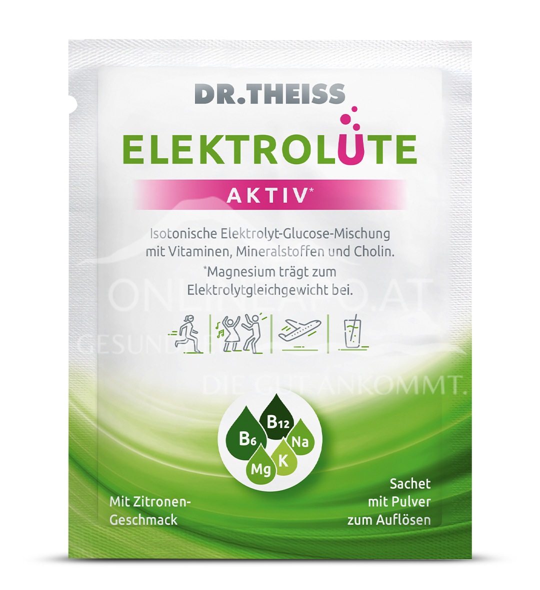 Die Dr. Theiss Elektrolüte AKTIV* Sachets sind ein Nahrungsergänzungsmittel zum Auflösen in Wasser - Isotonische Elektrolyt-Glucose-Mischung mit Vitaminen, Mineralstoffen und Cholin. *Magnesium trägt zum Elektrolytgleichgewicht bei.