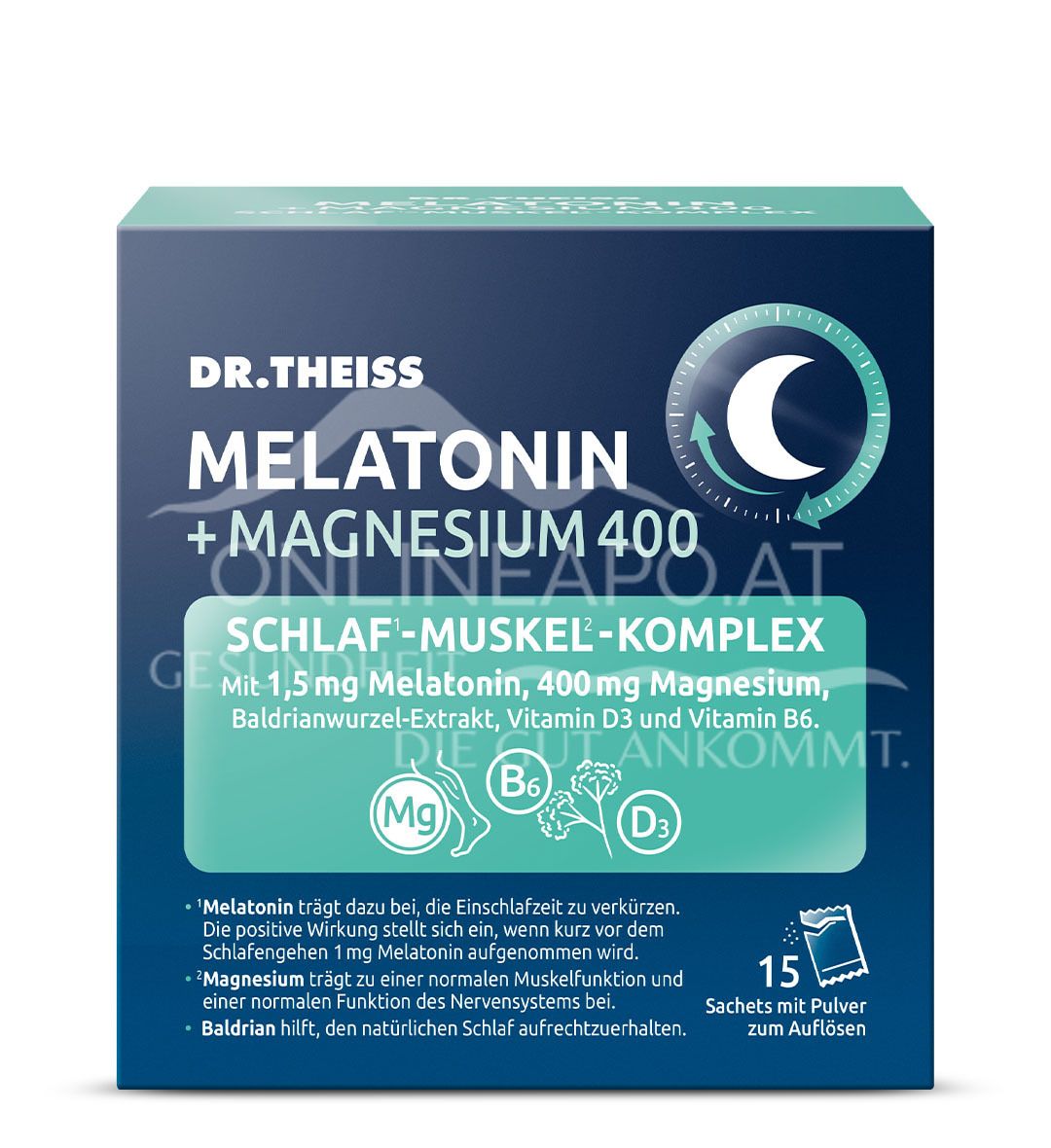 - Zusammensetzung pro Tagesdosis (1 Sachet) %NRV*: Melatonin 1,5 mg**, Baldrianwurzel-Extrakt 100 mg**, Magnesium 400 mg (= 107 % NRV*), Vitamin D3 25μg (= 500 % NRV*), Vitamin B6 1,4 mg (= 100 % NRV*). *NRV – Nährstoff bezugswert (nutrient reference value) nach Lebensmittelinformationsverordnung VO (EU) 1169/2011. **kein Nährstoff bezugswert vorhanden.
