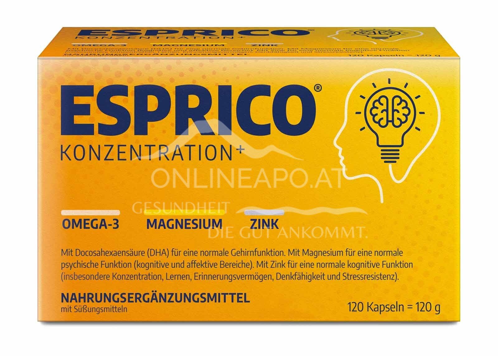 Die ESPRICO® Kaukapseln sind ein Nahrungsergänzungsmittel mit Omega-3-Fettsäuren, Magnesium und Zink. Mit Docosahexaensäure (DHA) für eine normale Gehirnfunktion. Mit Magnesium für eine normale psychische Funktion. Mit Zink für eine normale kognitive Funktion.