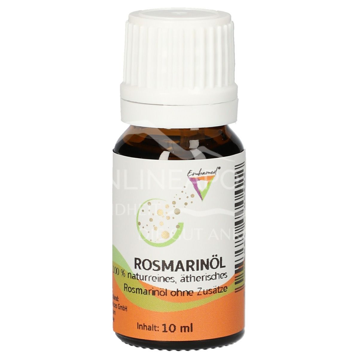 Das Embamed® Rosmarinöl ist ein zu 100 % naturreines, ätherisches Öl ohne Zusätze. Das hochwertige Öl eignet sich zur Anwendung in der Aromatherapie, als Badezusatz oder zur Raumbeduftung.