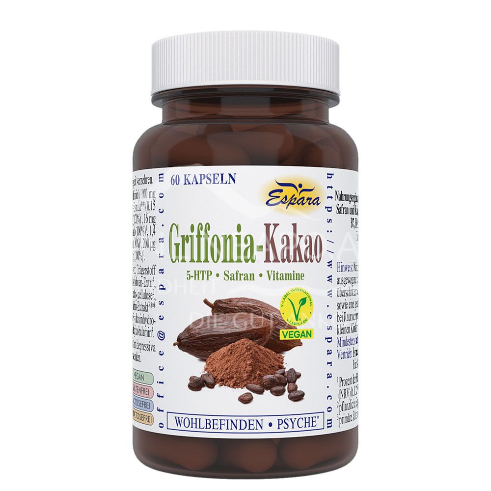 Unterstützen Sie Ihre mentale Stärke mit den Griffonia-Kakao Kapseln von Espara. Die Formel mit 5-HTP, kombiniert mit Kakao-Extrakt und Vitamin B5, trägt zu einer normalen geistigen Leistung und zur Funktion des Nervensystems bei.