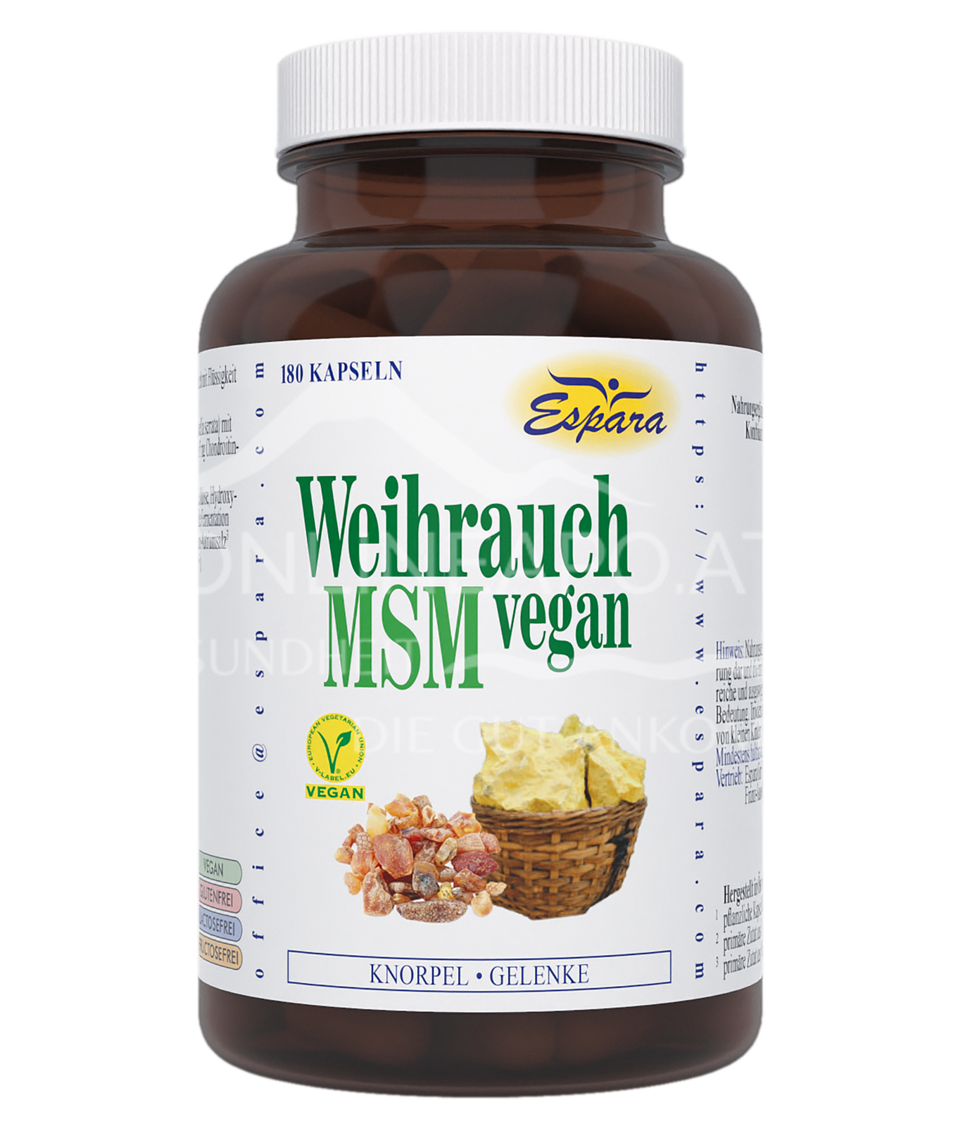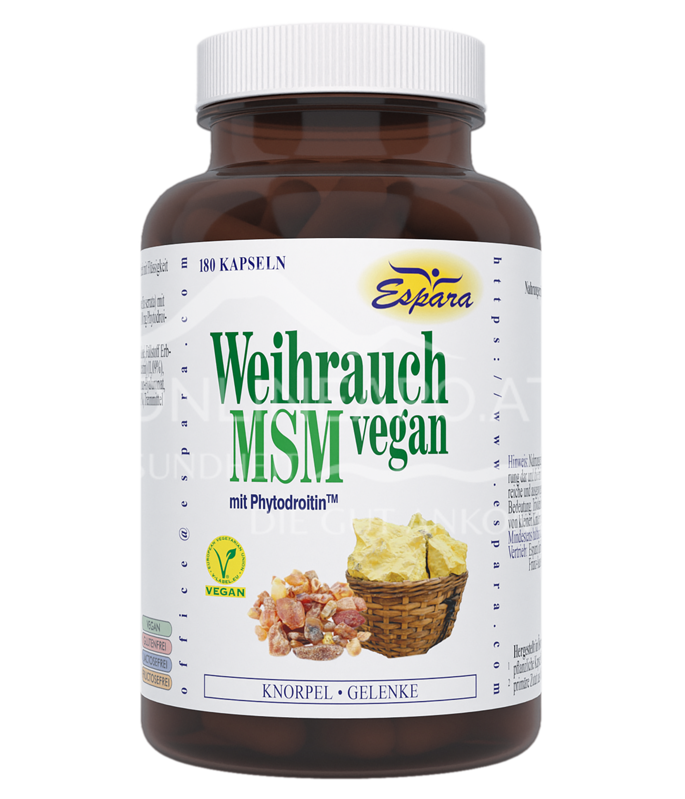 Espara Weihrauch MSM vegan Kapseln sind ein Nahrungsergänzungsmittel mit Weihrauch und Methylsulfonylmethan (MSM) in Kombination mit Hyaluronsäure und Chondroitinsulfat aus veganer Quelle.