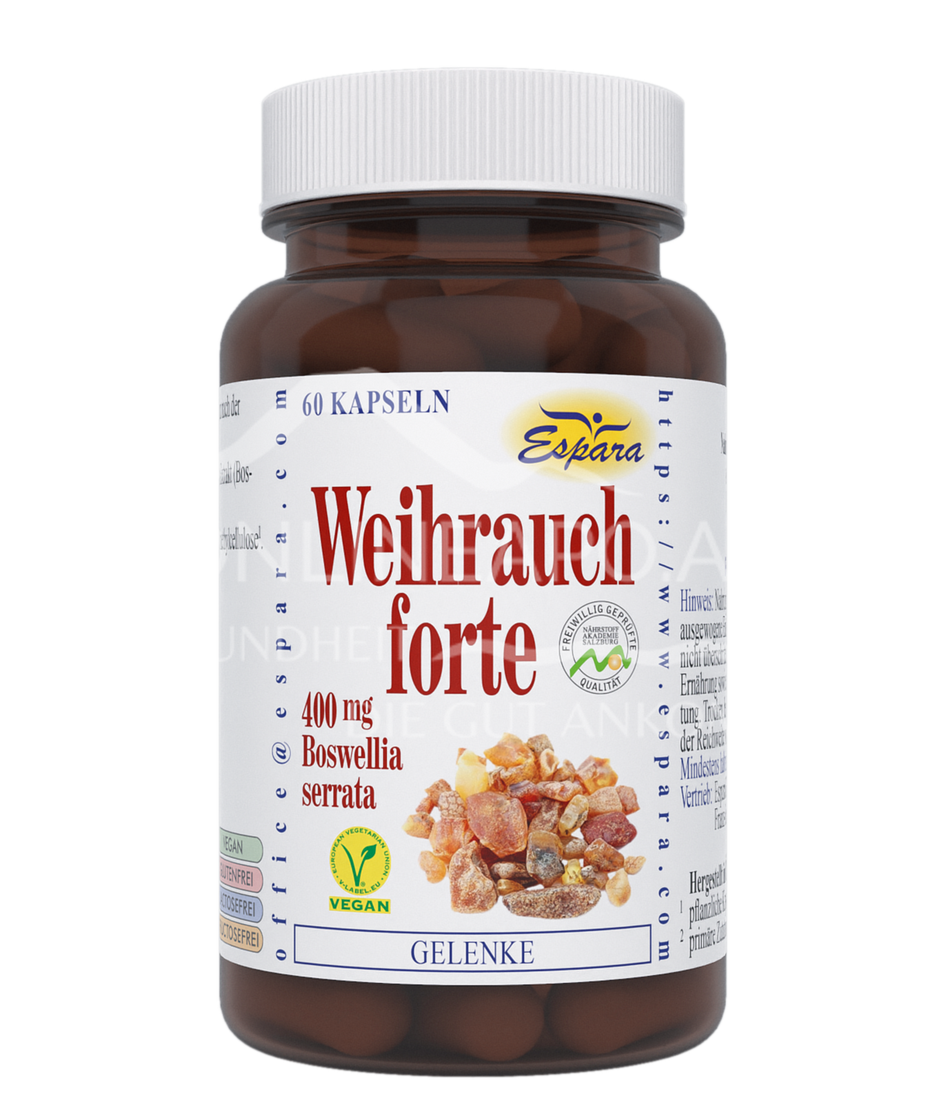 Espara Weihrauch forte Kapseln sind ein natürliches Nahrungsergänzungsmittel mit 400 mg Weihrauch-Extrakt (Boswellia serrata) mit mind. 280 mg Boswelliasäuren pro Kapsel.