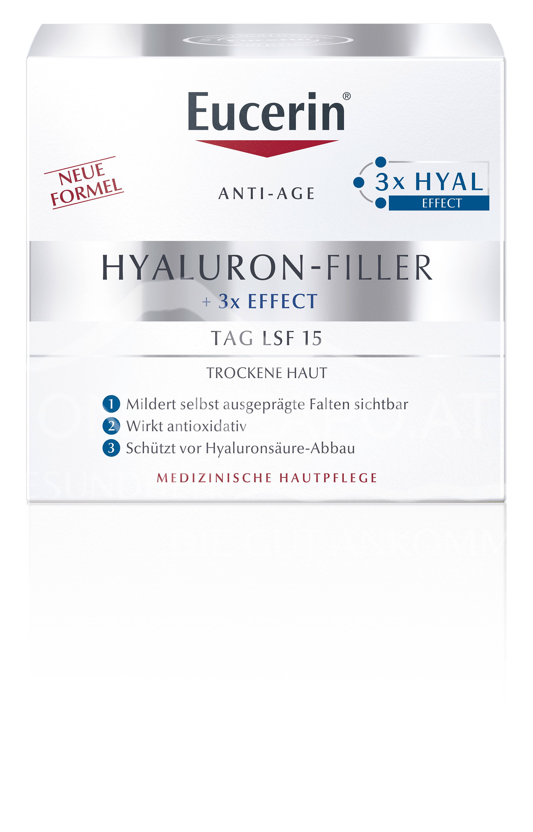 Eucerin® HYALURON-FILLER + 3x EFFECT LSF 15 Tagespflege für trockene Haut ist eine Anti-Age Tagescreme mit Hyaluron ist speziell für trockene Haut entwickelt worden. Glättet Falten, pflegt die Haut und beugt vorzeitiger Hautalterung vor.