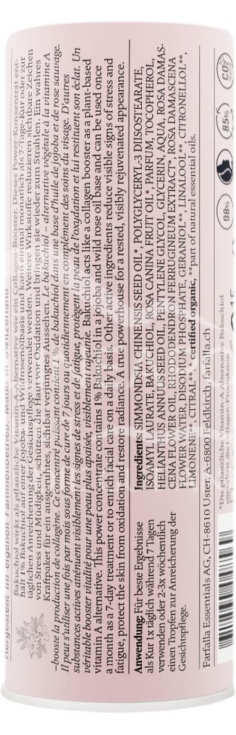 Bakuchiol wirkt als pflanzliche Vitamin-A-Alternative wie ein Collagen-Booster. Dieses Power-Konzentrat enthält 1% Bakuchiol auf einer Jojoba- und Wildrosenölbasis und kann einmal monatlich als 7-Tage-Kur oder zur täglichen Anreicherung der Gesichtspflege verwendet werden. Der innovative Wirkstoffkomplex aus Rosa Damascena reduziert die Stress-Biomarker der Haut und vermindert sichtbare Zeichen von Stress und Müdigkeit. Ein Extrakt aus Alpenrose schützt die Haut vor Oxidation und bringt sie wieder zum Strahlen. Hochwertiges Wildrosenöl wirkt zusätzlich antioxidativ bei gestresster Haut. Ein wahres Kraftpaket für ein ausgeruhtes, sichtbar verjüngtes Aussehen.