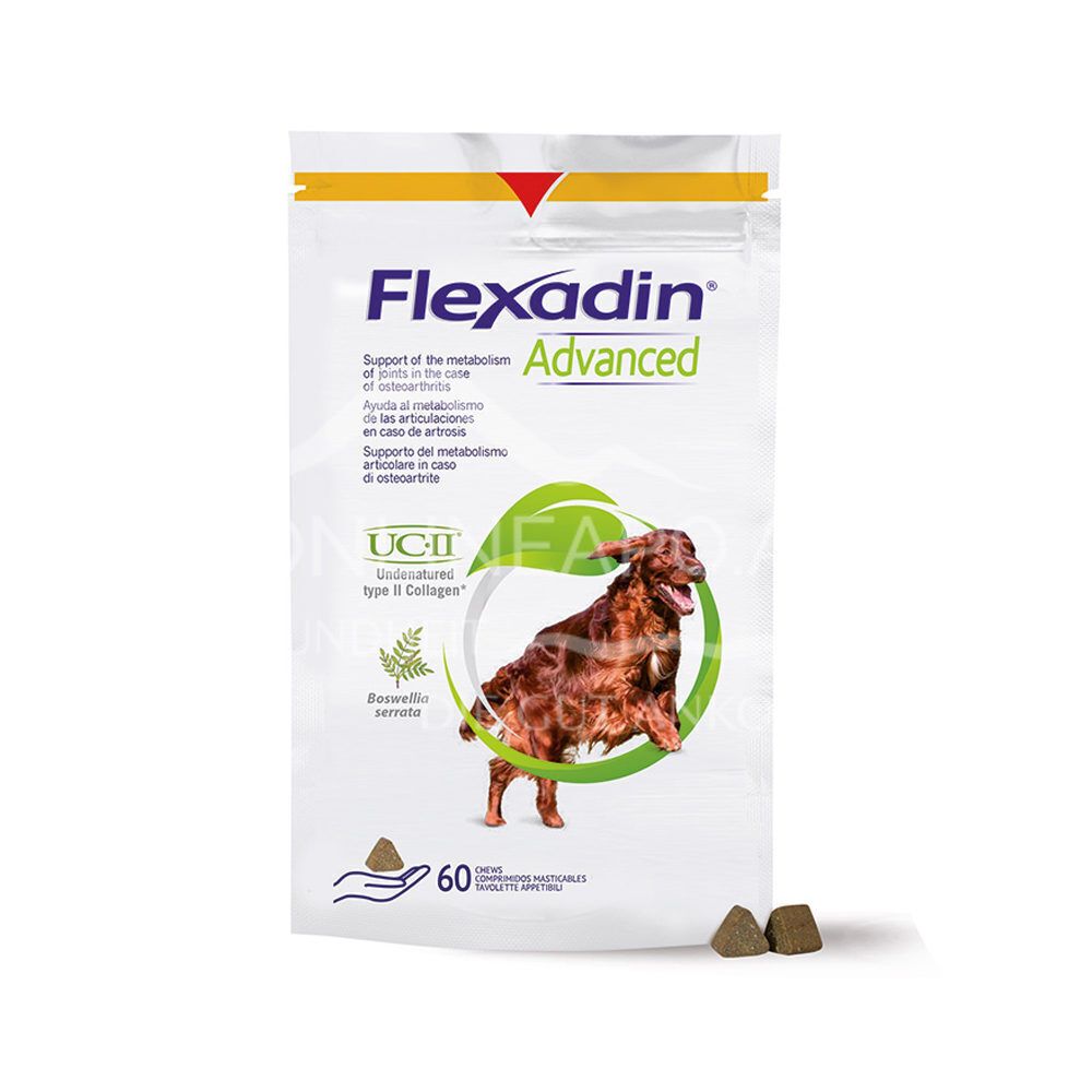 Flexadin Advanced Chews für Hunde sind ein Ergänzungsfuttermittel zur Unterstützung der Gelenkgesundheit bei Hunden jeden Alters. Die schmackhaften Kautabletten enthalten eine einzigartige Kombination aus UC-II® Kollagen und Boswellia serrata.