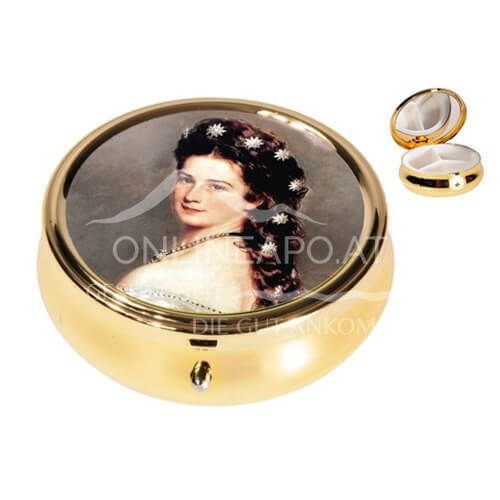 Praktisch und royal: Die Fridolin Pillendose im Sisi-Design bietet mit Spiegel und Unterteilung die perfekte Organisation für Ihre Medikamente unterwegs. Hochwertige Verarbeitung trifft auf das zeitlose Motiv der Kaiserin Elisabeth von Österreich.