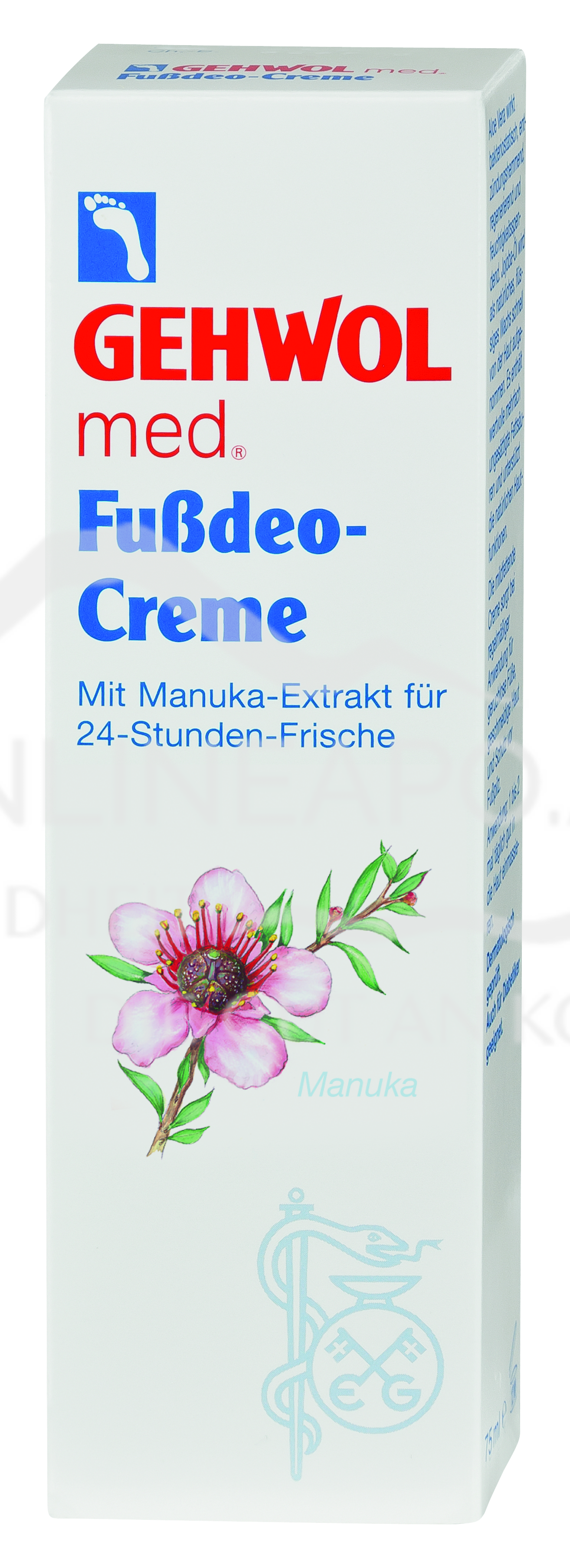 Mit Manuka-Extrakt für 24-Stunden-Frische GEHWOL med Fußdeo-Creme mit neuem, angenehmem Duft kombiniert den hochkonzentrierten Wirkstoffextrakt des Manuka-Öls mit mikronisiertem Zinkoxid zur Beseitigung von starkem Fußgeruch für mindestens 24 Stunden in einer pflegenden Cremegrundlage mit Jojoba-Öl und Aloe Vera.