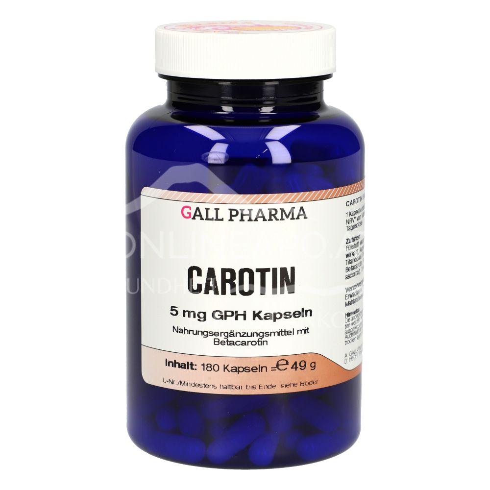 Gall Pharma Carotin 5 mg Kapseln sind ein Nahrungsergänzungsmittel mit Beta-Carotin, einer Vorstufe des Vitamin A. Beta-Carotin ist ein Antioxidans, das den Körper vor freien Radikalen schützt und zur Erhaltung normaler Sehkraft und Schleimhäute beiträgt.