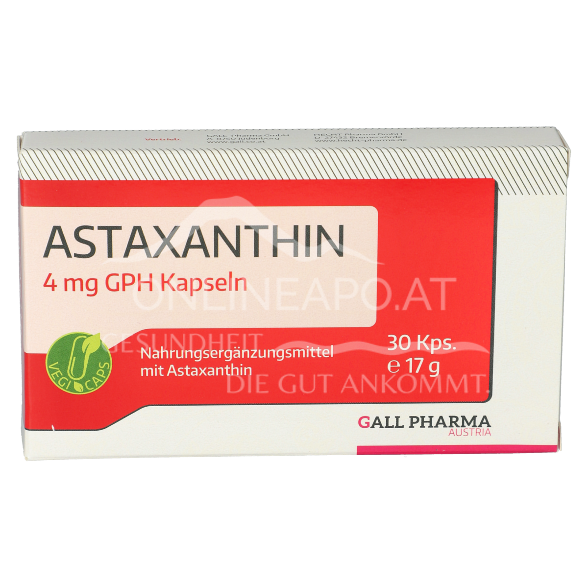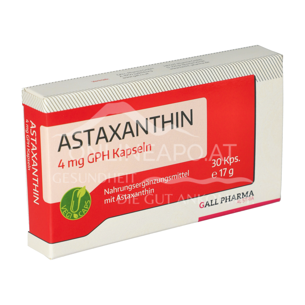Die Gall Pharma Astaxanthin 4 mg Kapseln sind ein Nahrungsergänzungsmittel mit Astaxanthin einem Carotinoid, das von einzelligen Grünalgen der Gattung Haematococcus pluvialis (Blutregenalge) zum eigenen Schutz gebildet wird.