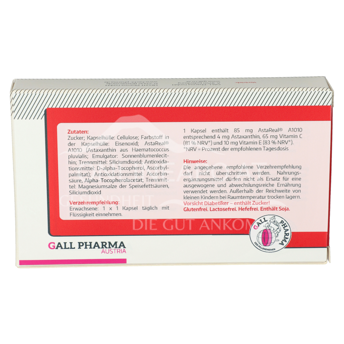 - Zutaten: Füllstoff: Zucker; AstaReal® A1010 (Astaxanthin aus Haematococcus pluvialis; Emulgator: Sonnenblumenlecithin; Trennmittel: Siliciumdioxid; Antioxidationsmittel: D-alpha-Tocopherol, Ascorbylpalmitat); Antioxidationsmittel: Ascorbinsäure, Alpha-Tocopherolacetat; Füllstoff: Mikrokristaline Cellulose; Trennmittel: Magnesiumsalze der Speisefettsäuren, Siliciumdioxid; Kapselhülle: Cellulose; Farbstoff in der Kapselhülle: Eisenoxid.