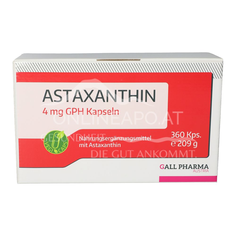 Die Gall Pharma Astaxanthin 4 mg Kapseln sind ein Nahrungsergänzungsmittel mit Astaxanthin einem Carotinoid, das von einzelligen Grünalgen der Gattung Haematococcus pluvialis (Blutregenalge) zum eigenen Schutz gebildet wird.