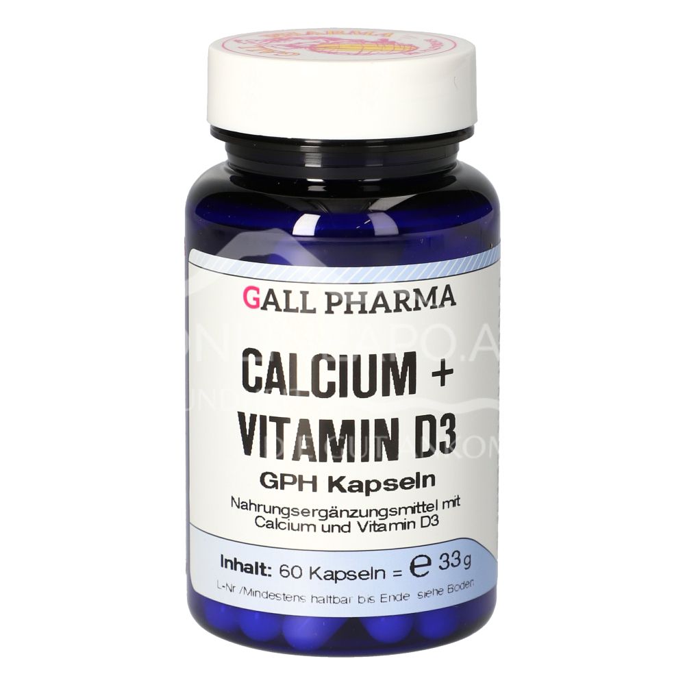 Gall Pharma Calcium + Vitamin D3 Kapseln sind ein Nahrungsergänzungsmittel mit 800 mg Calcium und 5 µg Vitamin D3 pro Tagesdosis. Die Kombination trägt zum Erhalt normaler Knochen und Zähne bei und unterstützt das Immunsystem.