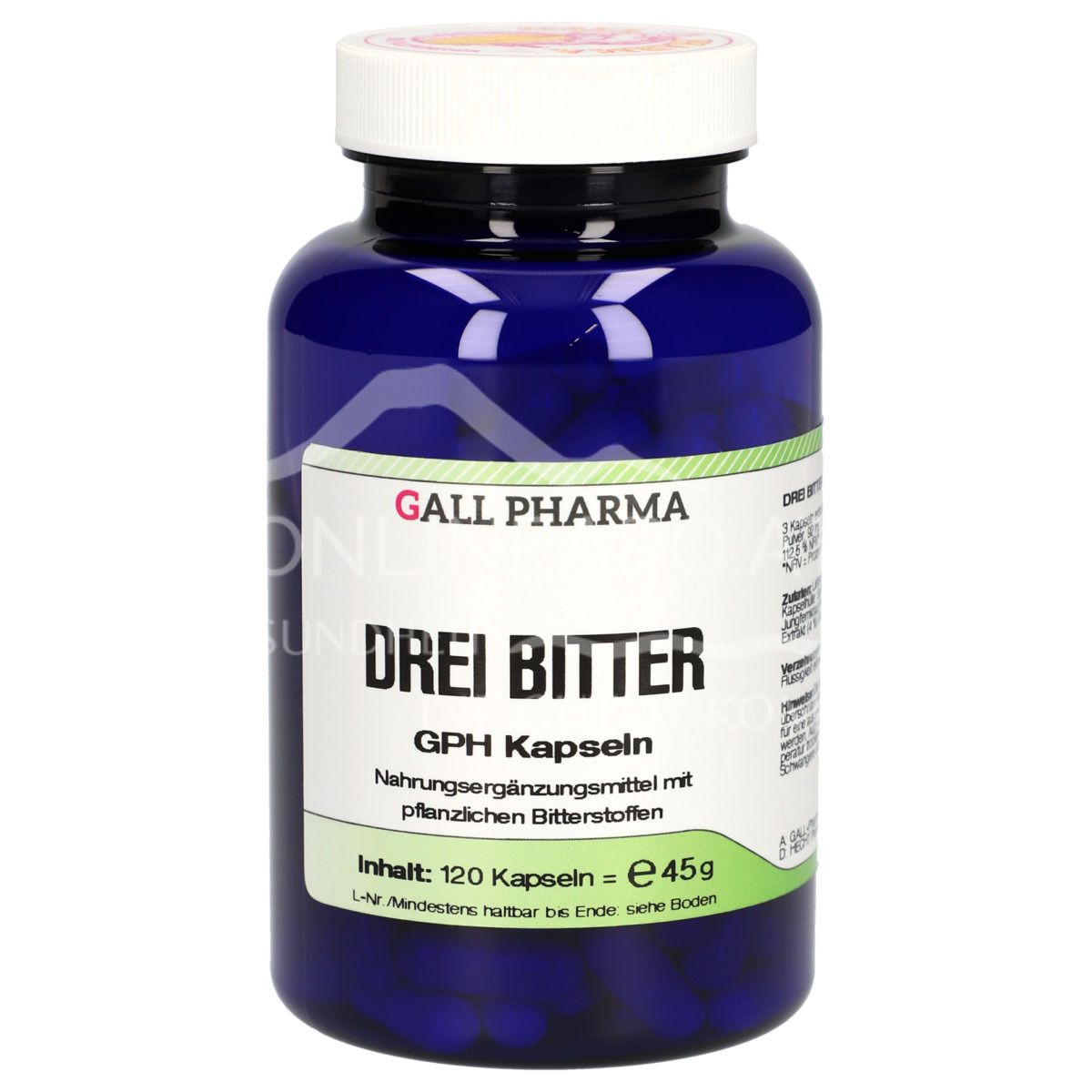 Die Gall Pharma Drei Bitter® Kapseln sind ein Nahrungsergänzungsmittel mit pflanzlichen Bitterstoffen, wie Rucola Pulver, Liebstöckelblatt-Pulver, Jungfernkraut Pulver, Vitamin C und Guarana Extrakt.