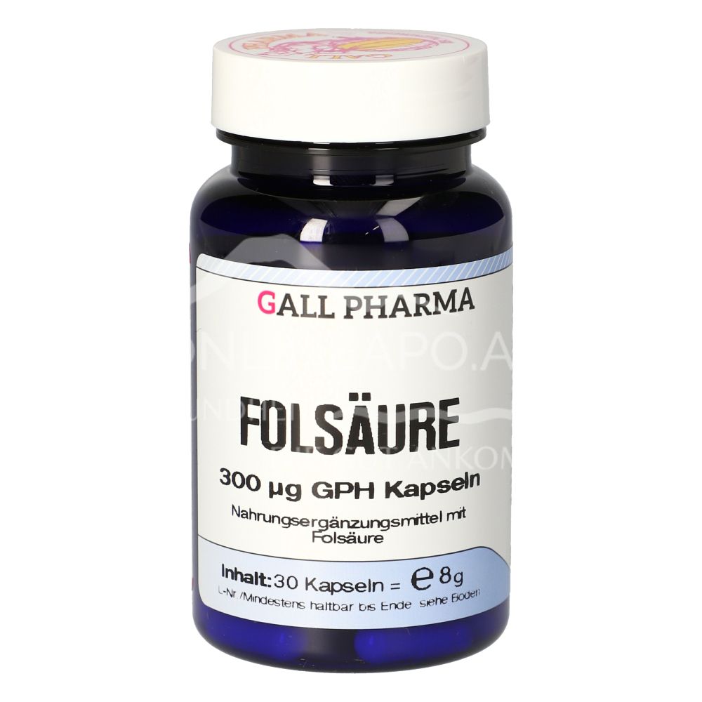 Gall Pharma Folsäure Kapseln sind ein Nahrungsergänzungsmittel mit 300 µg Folsäure pro Kapsel. Folsäure (Vitamin B9) unterstützt das Wachstum und die Vermehrung der Zellen und kann den erhöhten Folsäurebedarf während einer Schwangerschaft decken.