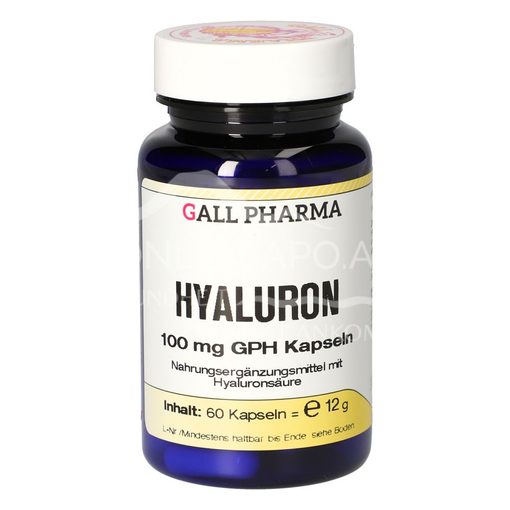 Die Gall Pharma Hyaluron 100 mg Kapseln sind ein Nahrungsergänzungsmittel mit hochwertigem Natriumsalz der Hyaluronsäure. Hyaluronsäure trägt zu einem strahlenden Hautbild bei und unterstützt die Regeneration der Haut.