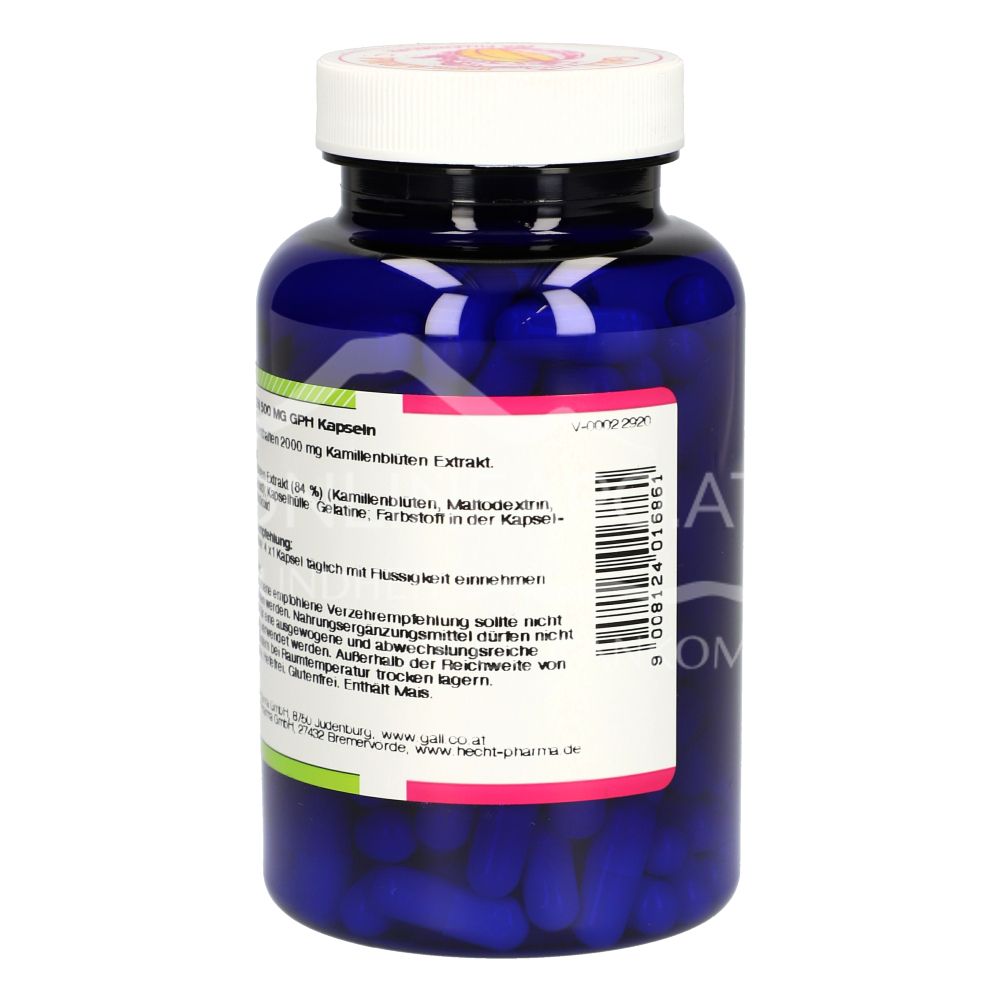 - Zusammensetzung pro Tagesdosis (4 Kapseln): 2000 mg Kamillenblüten Extrakt.
