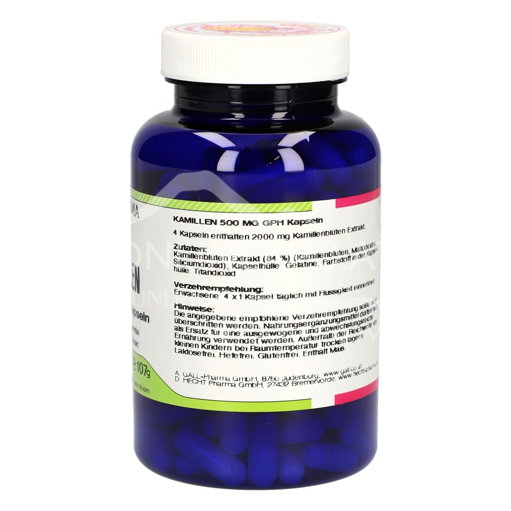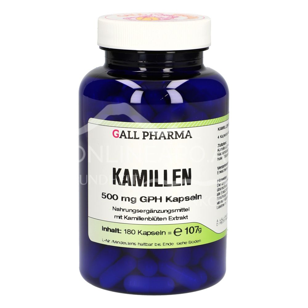 Gall Pharma Kamille 500 mg Kapseln sind ein Nahrungsergänzungsmittel mit 500 mg eines wässrigen 4:1 Kamillenblüten-Extrakts pro Kapsel.