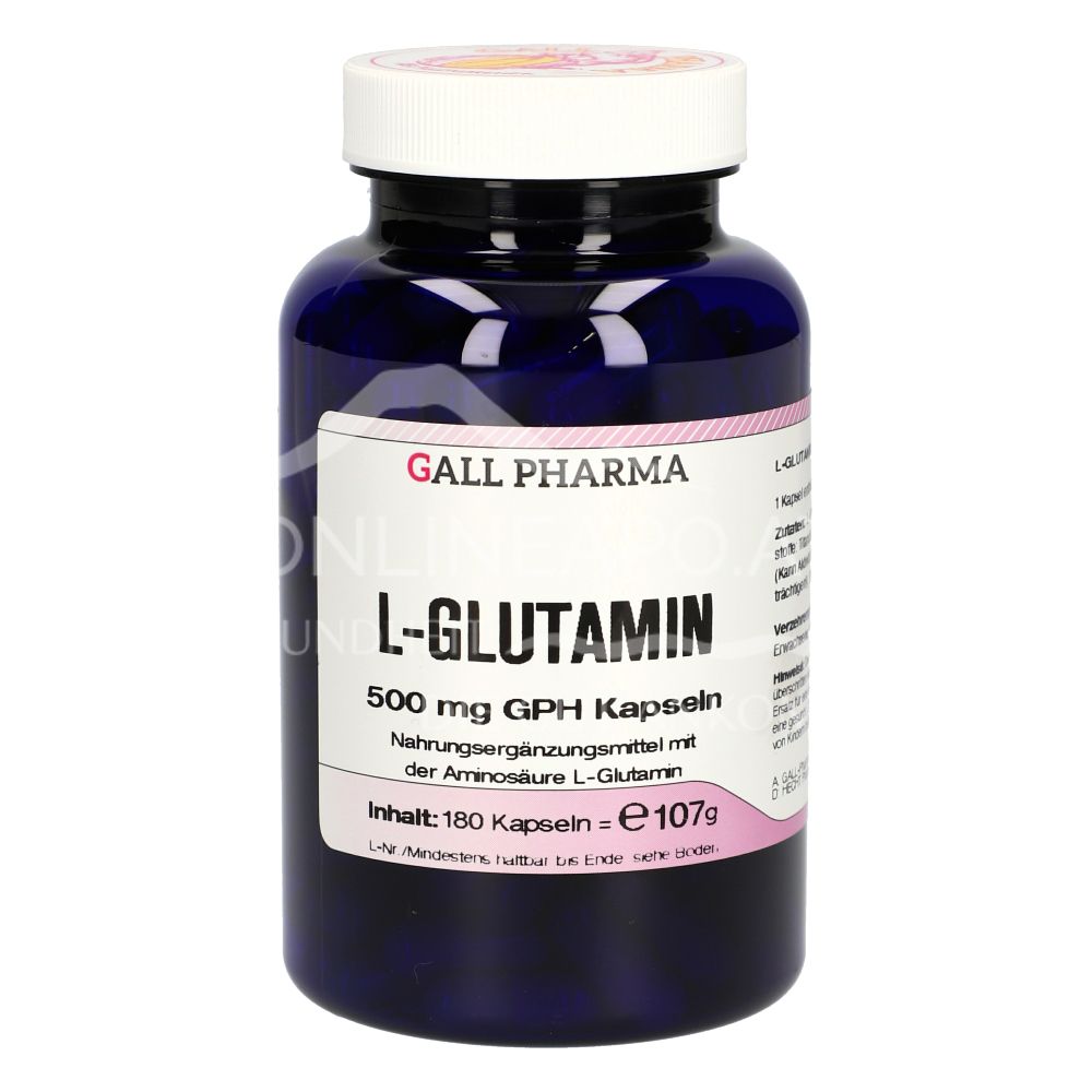 Gall Pharma L-Glutamin Kapseln sind ein Nahrungsergänzungsmittel mit 500 mg L-Glutamin pro Kapsel. Die Aminosäure trägt zur Gedächtnis- und Konzentrationsleistung bei, liefert den Körperzellen Energie, unterstützt die Entgiftung und fördert die Motorik.