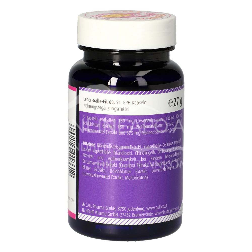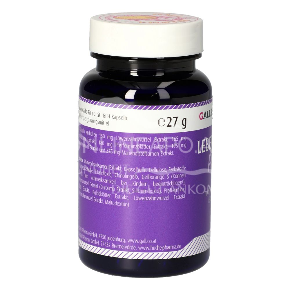 Die Gall Pharma Leber-Galle Fit Kapseln sind ein Nahrungsergänzungsmittel mit Mariendistelsamen Extrakt, Curcumawurzel Extrakt, Pfefferminzblätter Extrakt, Boldoblätter Extrakt und Löwenzahnwurzel Extrakt.