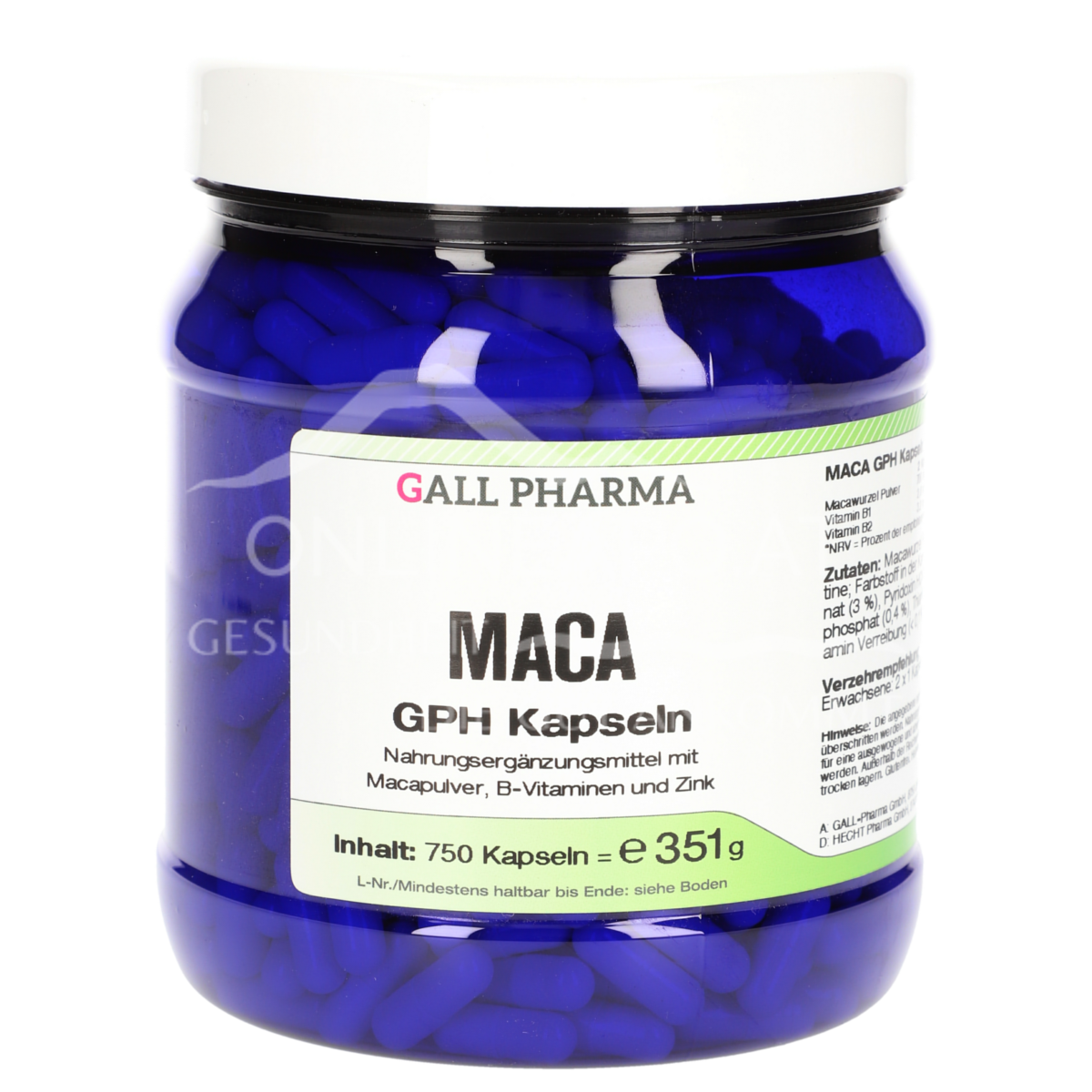 Gall Pharma Maca Kapseln sind ein Nahrungsergänzungsmittel mit 350 mg Maca-Wurzel-Pulver, 1,4 mg Vitamin B1, 1,6 mg Vitamin B2, 2 mg Vitamin B6, 3 µg Vitamin B12 und 17,5 mg Zinkgluconat pro Kapsel.