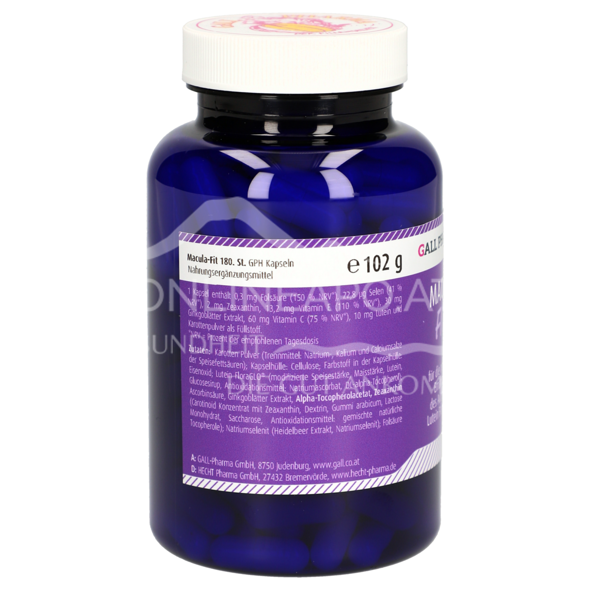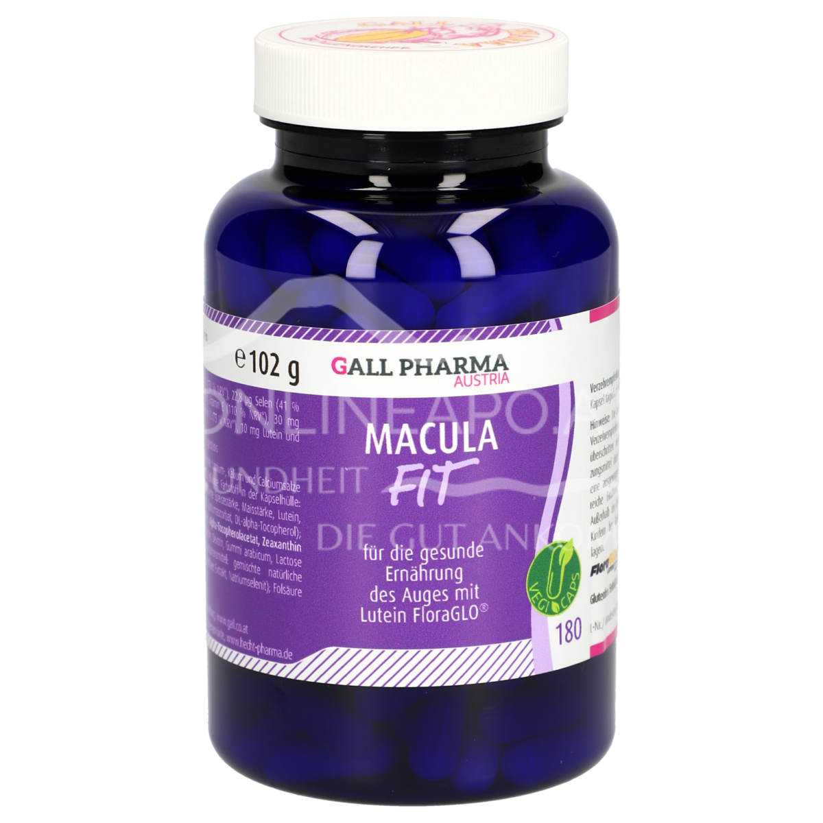 Die Gall Pharma Macula Fit Kapseln sind ein Nahrungsergänzungsmittel mit Karotten Pulver, Lutein, Vitamin C, Ginkgoblätter Extrakt, Vitamin E, Zeaxanthin, Folsäure und Selen pro Kapsel. Zur Unterstützung der normalen Sehfunktion.