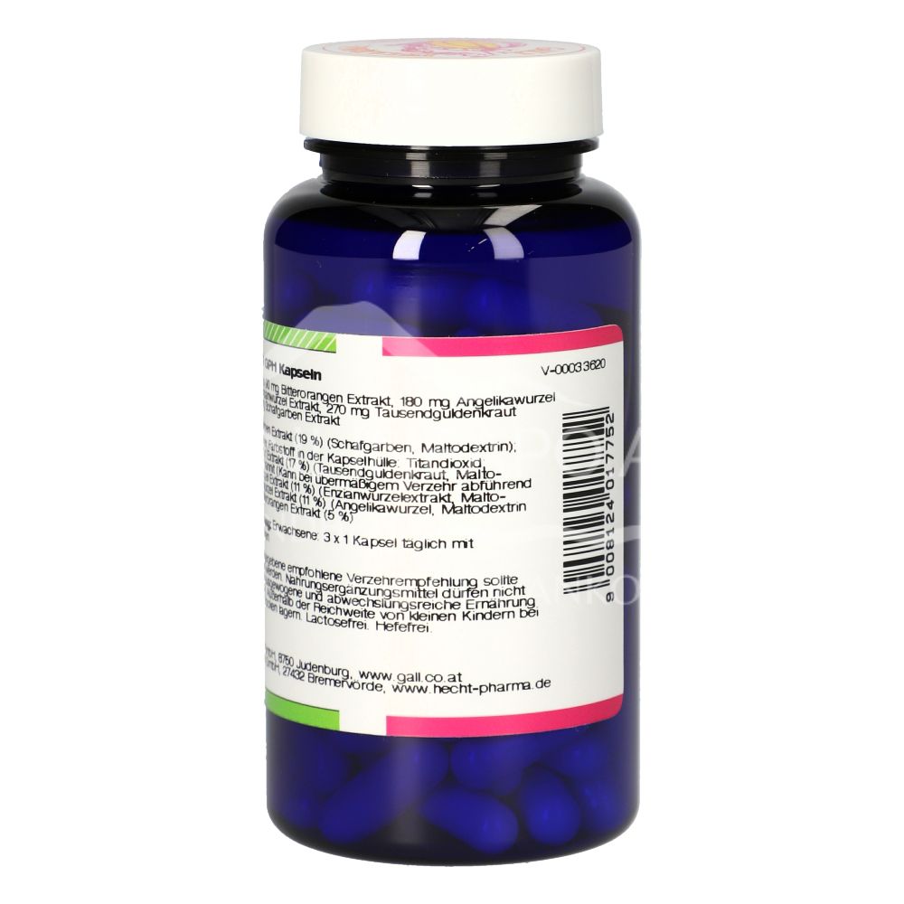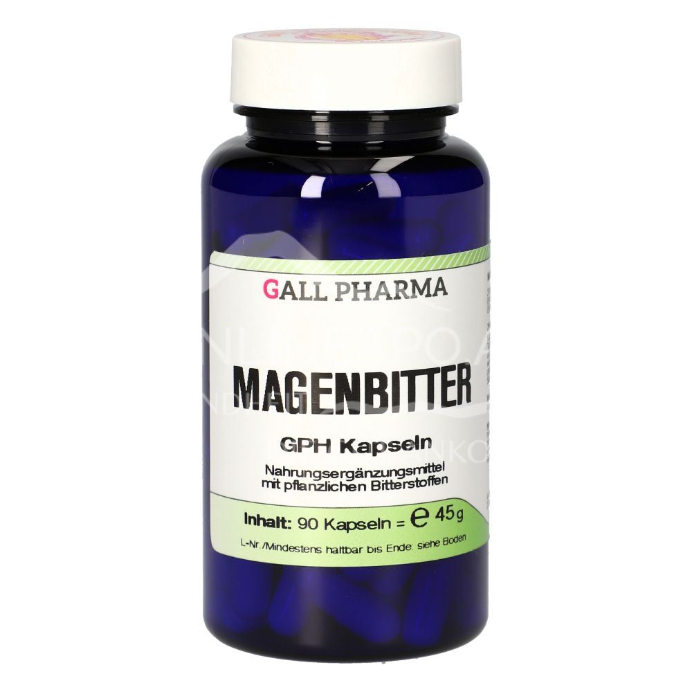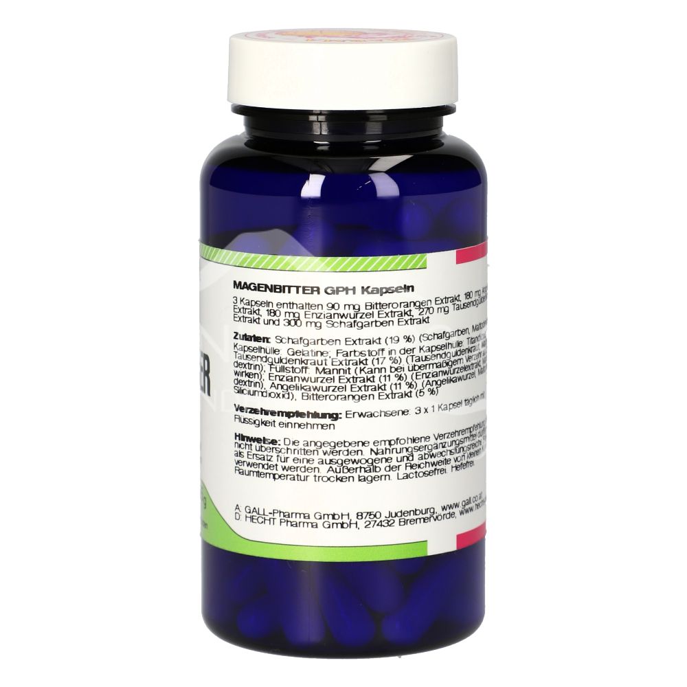 Die Gall Pharma Magenbitter Kapseln sind ein Nahrungsergänzungsmittel mit 100 mg Schafgarbenkrautextrakt, 90 mg Tausendguldenkrautextrakt, 60 mg Enzianwurzelextrakt, 60 mg Angelikawurzelextrakt und 30 mg Bitterorangenextrakt pro Kapsel.
