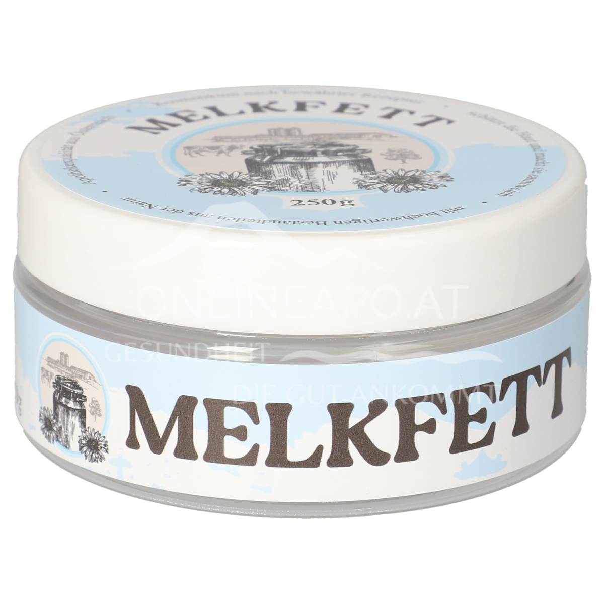 Extreme Kälte und Wind können die Haut austrocknen und schädigen. Melkfett ist ein altbewährtes Hautpflegemittel aus Vaseline, eine wasserfreie Mischung aus Kohlenwasserstoffen mit salben- bis pastenförmiger Konsistenz. Dank der schützenden Fettschicht wird die Körperwärme langsamer in die Umgebung abgegeben, so dass der Temperaturverlust bei winterlichen Outdoor-Aktivitäten ausgeglichen wird. Aber Melkfett hilft nicht nur bei extremen Witterungsbedingungen, sondern unterstützt auch die Regeneration der Haut bei übermäßiger Reinigung oder Kontakt mit Waschlaugen, Spülmitteln und Chemikalien. Die natürliche Rückfettung der Haut wird bewahrt und rissige Hände, Ellenbogen, Fersen oder Mundwinkel werden wieder weich und geschmeidig.