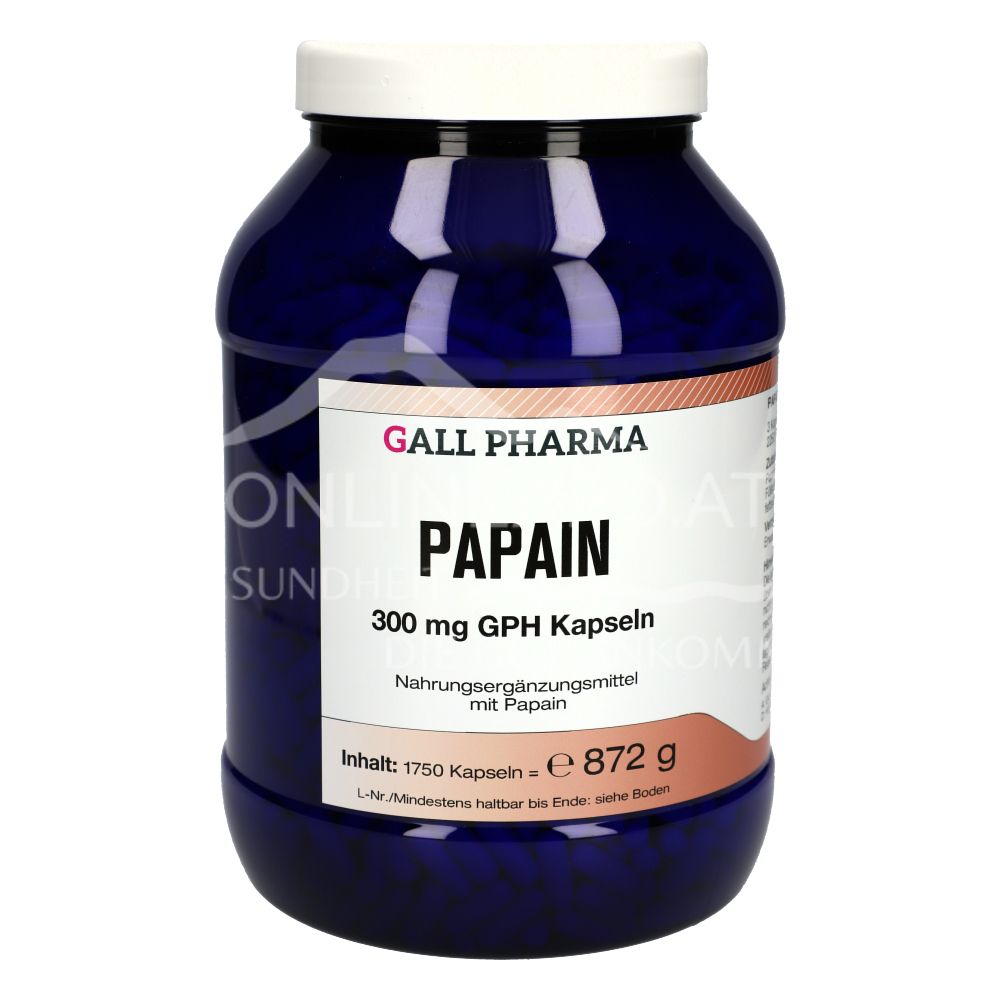 Gall Pharma Papain Kapseln sind ein Nahrungsergänzungsmittel mit 300 mg Papain entsprechend 750 FIP-Einheiten pro Kapsel. Das pflanzliche Enzym kann den Stoffwechsel anregen, Magen- & Darmbeschwerden mindern und die Wundheilung begünstigen.