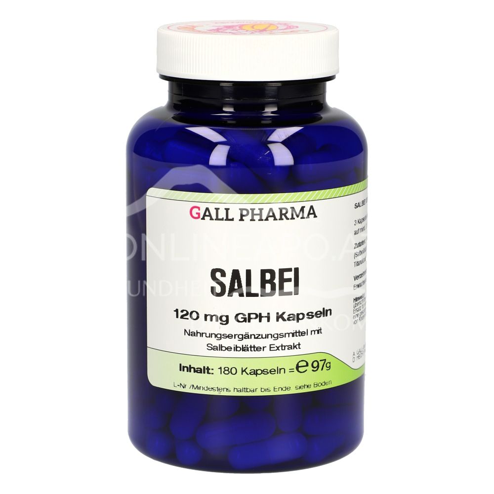 Gall Pharma Salbei 120 mg Kapseln sind ein Nahrungsergänzungsmittel, das zur Verminderung von Schweißbildung, speziell auch Nachtschweißbildung, eingesetzt werden kann. Mit Rosmarinsäure angereicherten Extrakt aus Salbeiblättern.