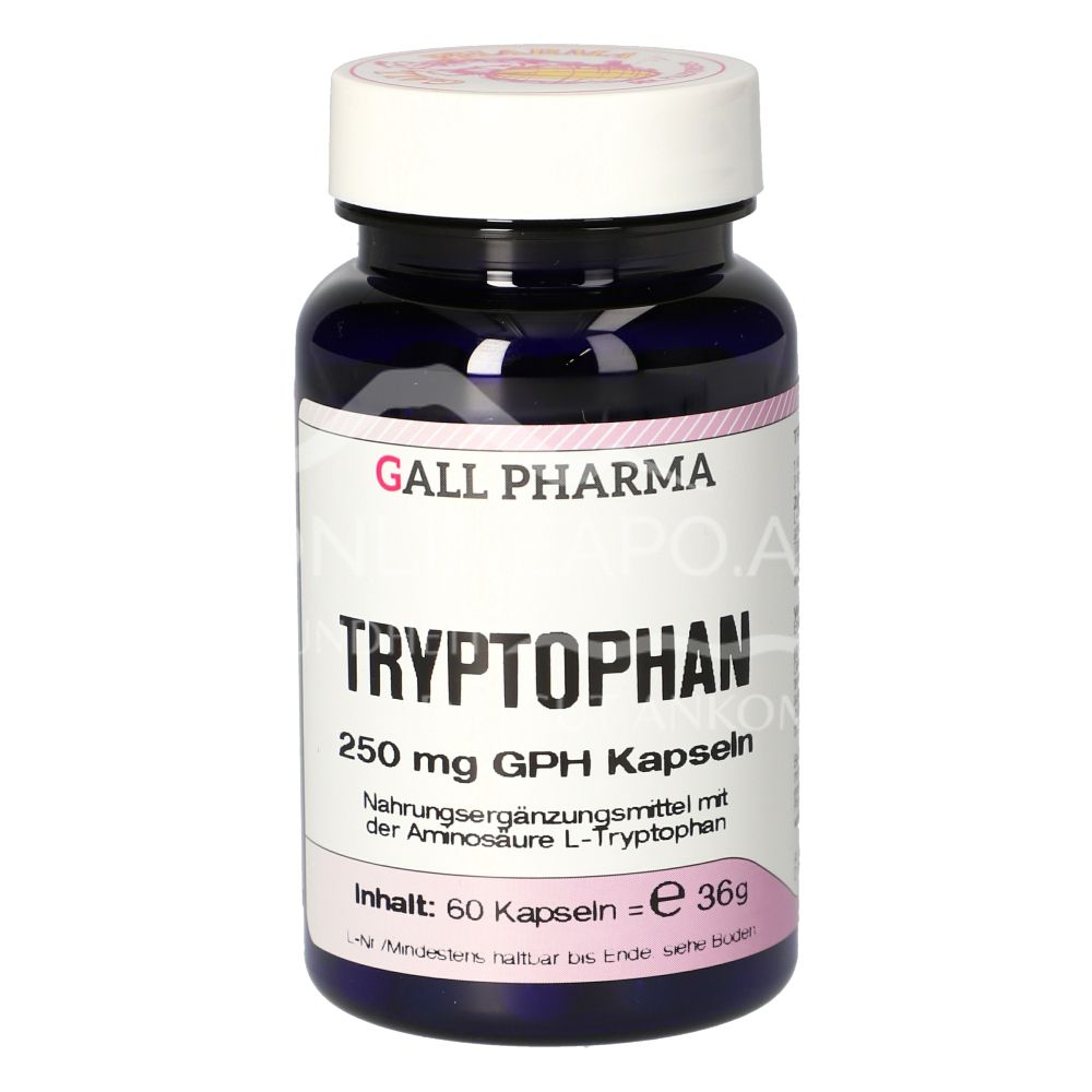 Gall Pharma Tryptophan Kapseln ist ein Nahrungsergänzungsmittel mit 250 mg L-Tryptophan pro Kapsel. Die Aminosäure L-Tryptophan reguliert den Schlaf-Wach-Rhythmus, beeinflusst die Stimmungslage positiv und beschleunigt die Blutgerinnung.