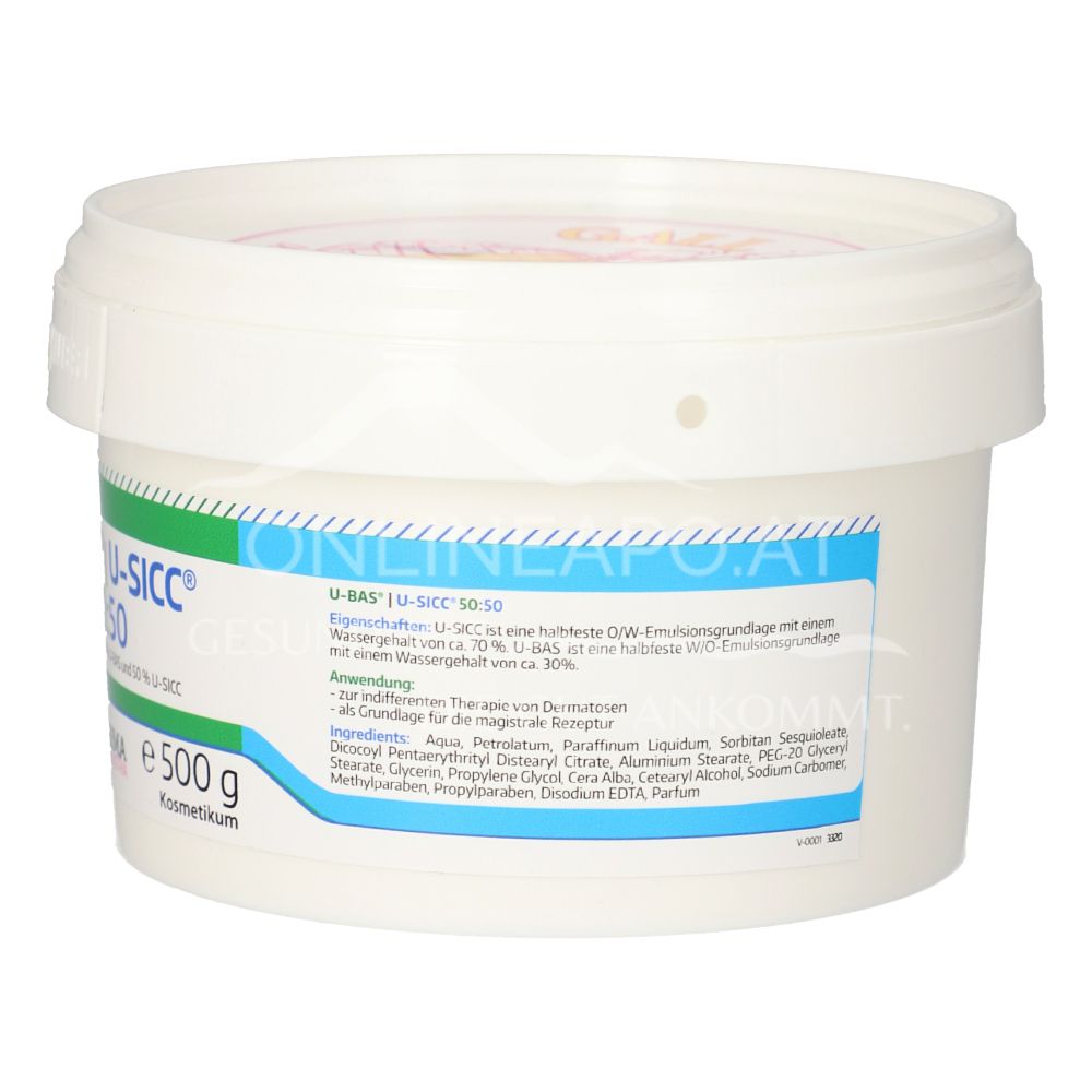 Sowohl U-Bas®, als auch U-Sicc® sind hypoallergene Salbengrundlagen. Die Mischung ist besonders zur Pflege von trockener, sensibler Haut, sowie atopischen Hauterscheinungen geeignet. Gleichzeitig unterstützt sie den Ausgleich des natürlichen Fett- und Feuchtigkeitshaushaltes der Haut und beugt chronischen Hautschäden vor. Die Herstellung erfolgt nach den GMP Richtlinien für pharmazeutische Produkte.