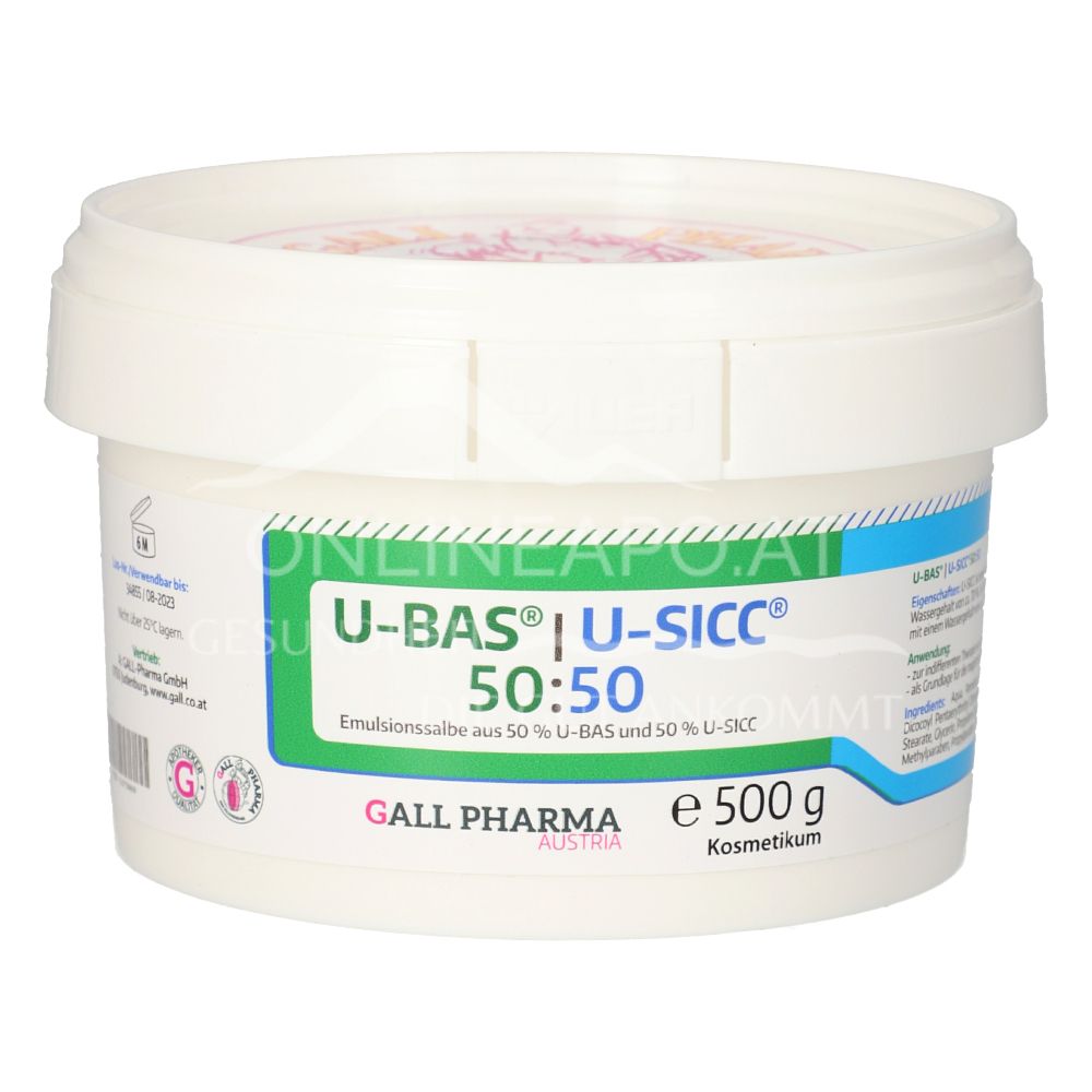 Die Gall Pharma U-Bas®/U-Sicc® 50:50 Emulsionssalbe ist eine halbfeste Kombination einer Wasser-in-Öl-Emulsionssalbe und einer Öl-in Wasser-Emulsion, die nicht nur wässrige, sondern auch fettige Substanzen aufnehmen kann.