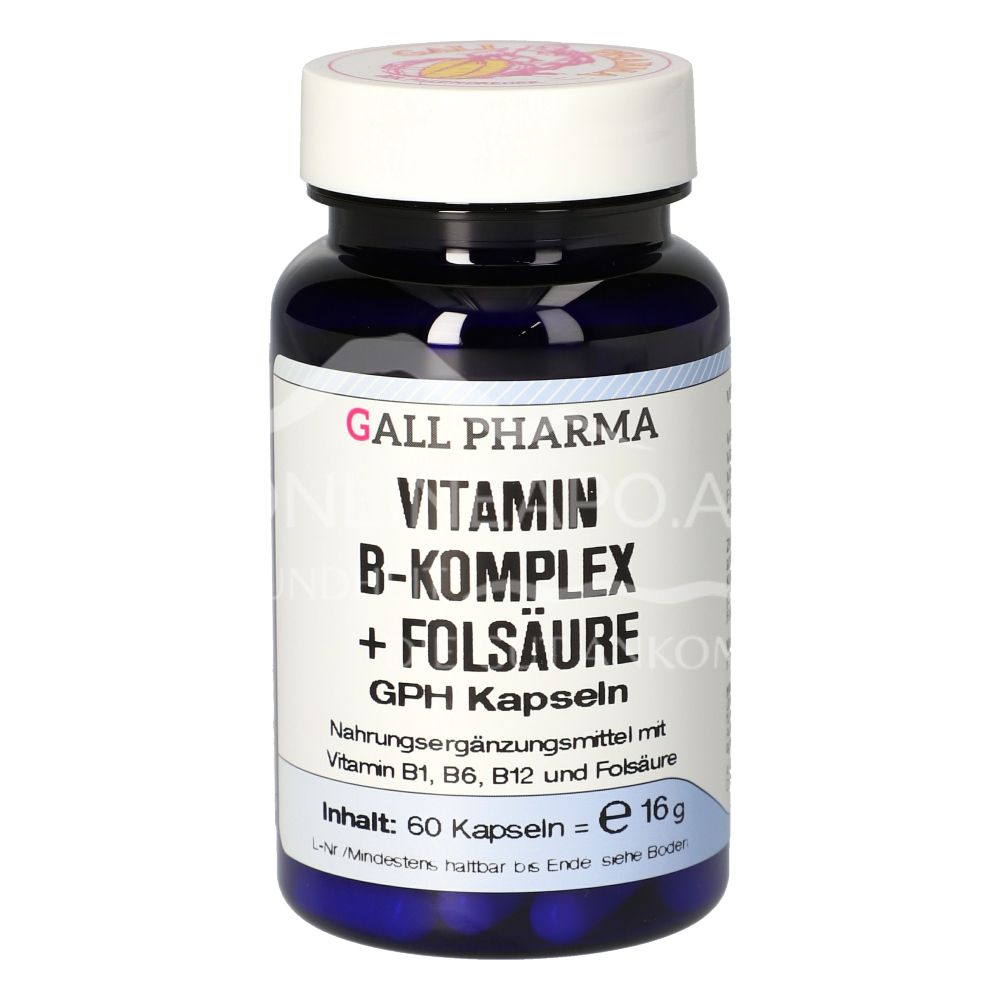 Gall Pharma Vitamin B Komplex + Folsäure Kapseln sind ein Nahrungsergänzungsmittel mit Vitamin B1, B6, B12 und Folsäure. Die enthaltenen B-Vitamine unterstützen den Stoffwechsel und tragen zu einer normalen Nervenfunktion bei.
