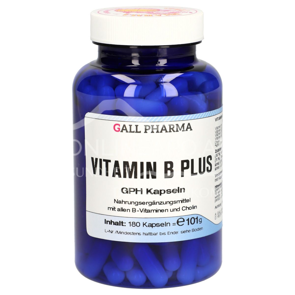 Die B-Vitamine sind wasserlösliche Vitamine und können nicht im Körper gespeichert werden. Das heißt, sie müssen regelmäßig über die Nahrung zugeführt werden. In Vitamin B Plus GPH Kapseln ist Thiamin (Vitamin B1), Riboflavin (Vitamin B2), Niacin (Vitamin B3), Pantothensäure (Vitamin B5), Pyridoxin (Vitamin B6), Biotin (Vitamin B7), Folsäure (Vitamin B9) und Cobalamin (Vitamin B12) enhalten. Zusätzlich ist Cholin enthalten, dies ist für eine funktionierende Reizweiterleitung von Nerven zu Muskeln wichtig und spielt auch für die Leber- und Gehirnfunktion eine wesentliche Rolle.