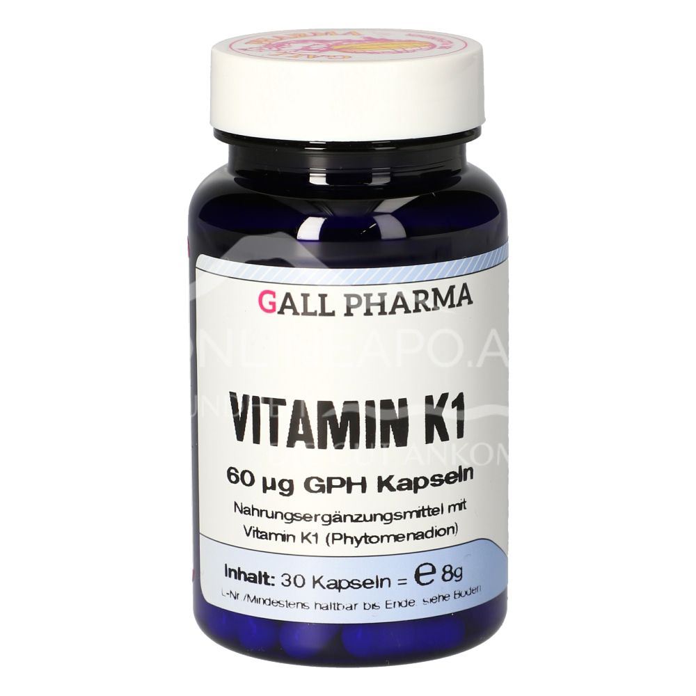 Gall Pharma Vitamin K1 Kapseln sind ein Nahrungsergänzungsmittel mit 60 µg Vitamin K1 pro Kapsel. Vitamin K1 normalisiert einen gestörten Knochenstoffwechsel, dient als Ergänzung bei erhöhter Calcium-Zufuhr und unterstützt die normale Blutgerinnung.