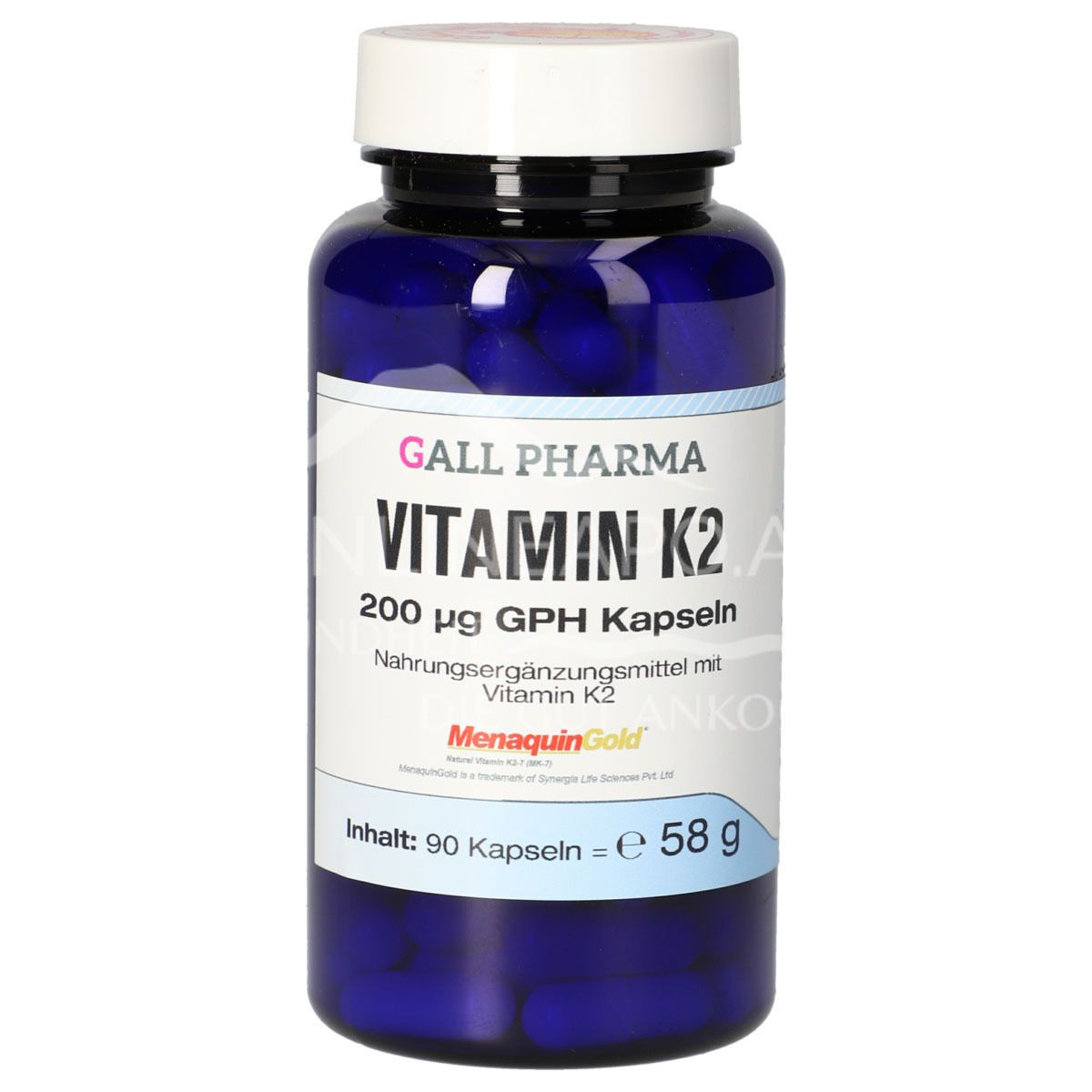 Die Gall Pharma Vitamin K2 200 mcg Kapseln sind ein Nahrungsergänzungsmittel mit Vitamin K2. Vitamin K2 trägt zur normalen Blutgerinnung und zum Erhalt normaler Knochen bei.