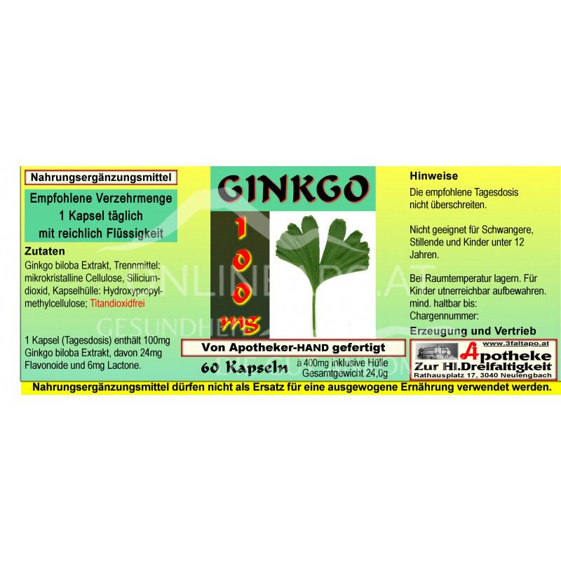 - Zusammensetzung pro Tagesdosis (1 Kapsel): 100mg Ginkgo biloba Extrakt, davon 24mg Flavonoide und 6mg Lactone.