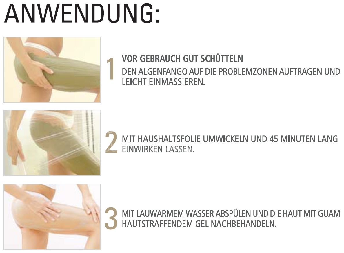 Den Algenschlamm auf die Problemzonen auftragen und leicht einmassieren. Die betroffenen Körperpartien mit Haushaltsfolie (Zellophan) umwickeln und das Algenkonzentrat während 45 Minuten einwirken lassen. Anschliessend mit lauwarmem Wasser abspülen und mit GUAM®Hautstraffende Creme nachpflegen.