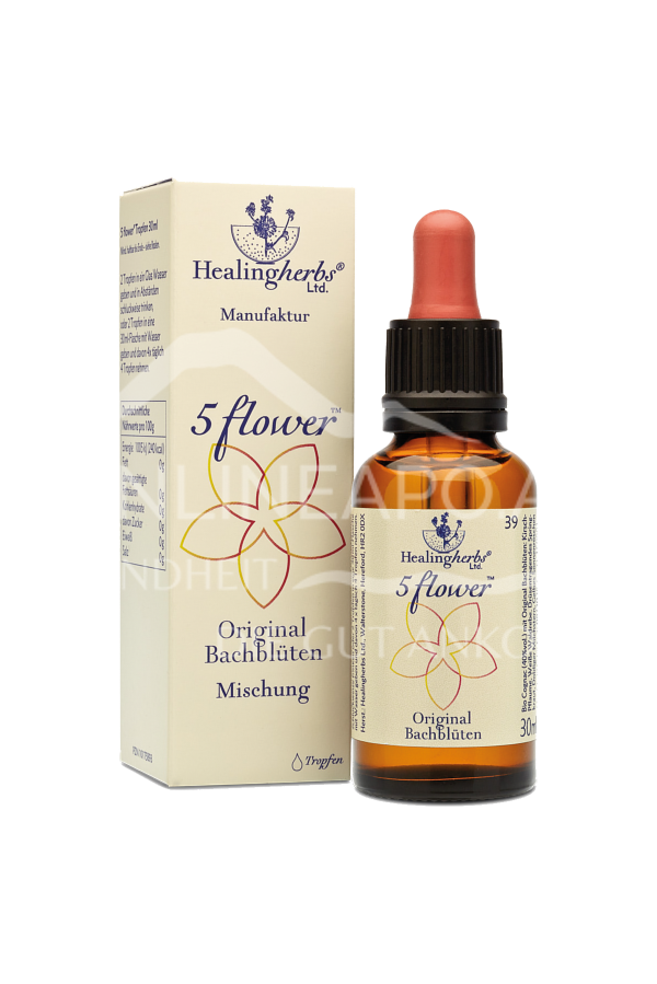 Anfänglich bezeichnete Dr. Bach die Bachblüte Rock Rose als die „Essenz für alle Notfälle“ und fügte hinzu, dass „einige andere Essenzen hilfreich sein“ könnten. So formulierte er schließlich die 5 Flower Essenz, indem er Rock Rose mit den Bachblüten Cherry Plum, Clematis, Impatiens und Star of Bethlehem kombinierte. Da die Tropfen aus 5 Blütenmitteln zusammengesetzt sind, tragen sie den Namen 5 Flower. Die Tropfen sind auch als Bachblüten Nr. 39 bekannt. Die spezielle 5 Flower Mischung überzeugt durch ihr einzigartiges Informationsmuster, das aus der Kombination der Einzelessenzen entsteht und die Tropfen so vielseitig macht in ihren Einsatzmöglichkeiten.