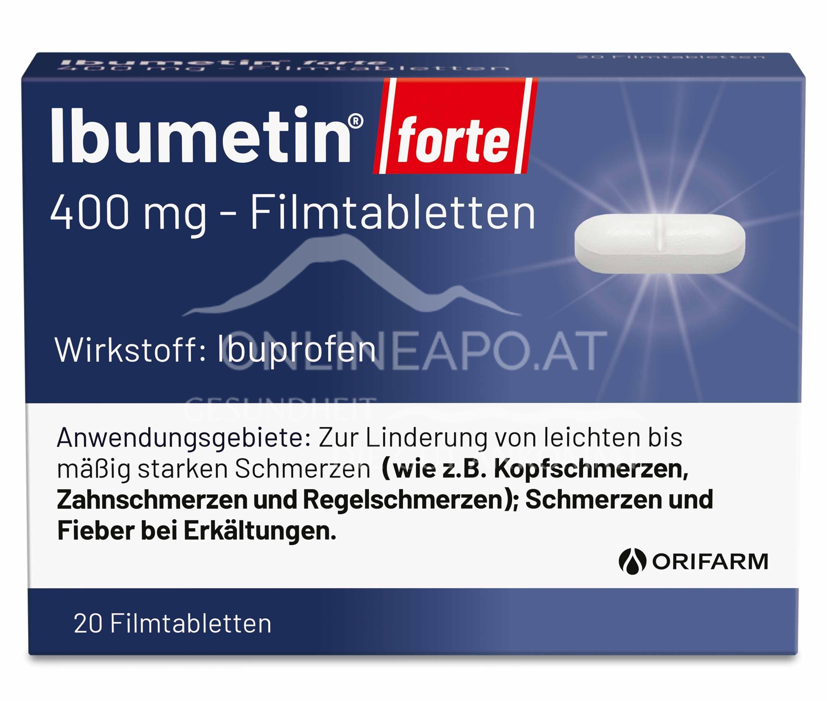 Die Ibumetin® forte 400 mg Filmtabletten ist ein Arzneimittel mit dem Wirkstoff Ibuprofen zur Linderung von von leichten bis mäßig starken Schmerzen (wie z.B. Kopfschmerzen, Zahnschmerzen und Regelschmerzen) und Fieber bei einer Erkältung.