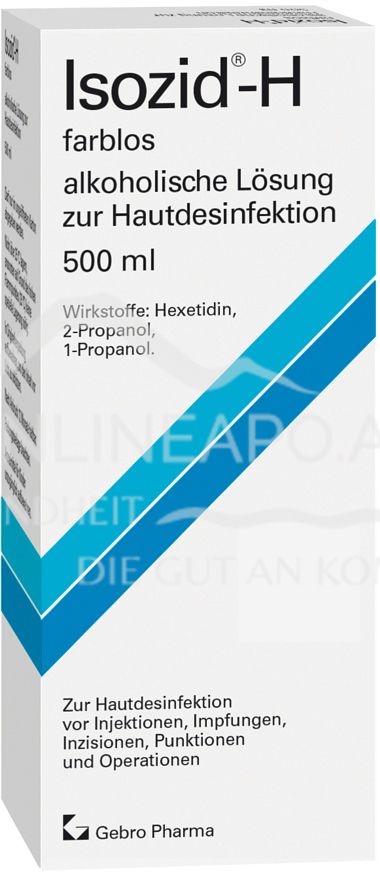 Isozid®-H farblos wird zur Desinfektion der Haut vor Injektionen, Impfungen, Inzisionen, Punktionen und Operationen eingesetzt, sofern nicht zur Markierung Isozid®-H gefärbt vorgezogen wird.