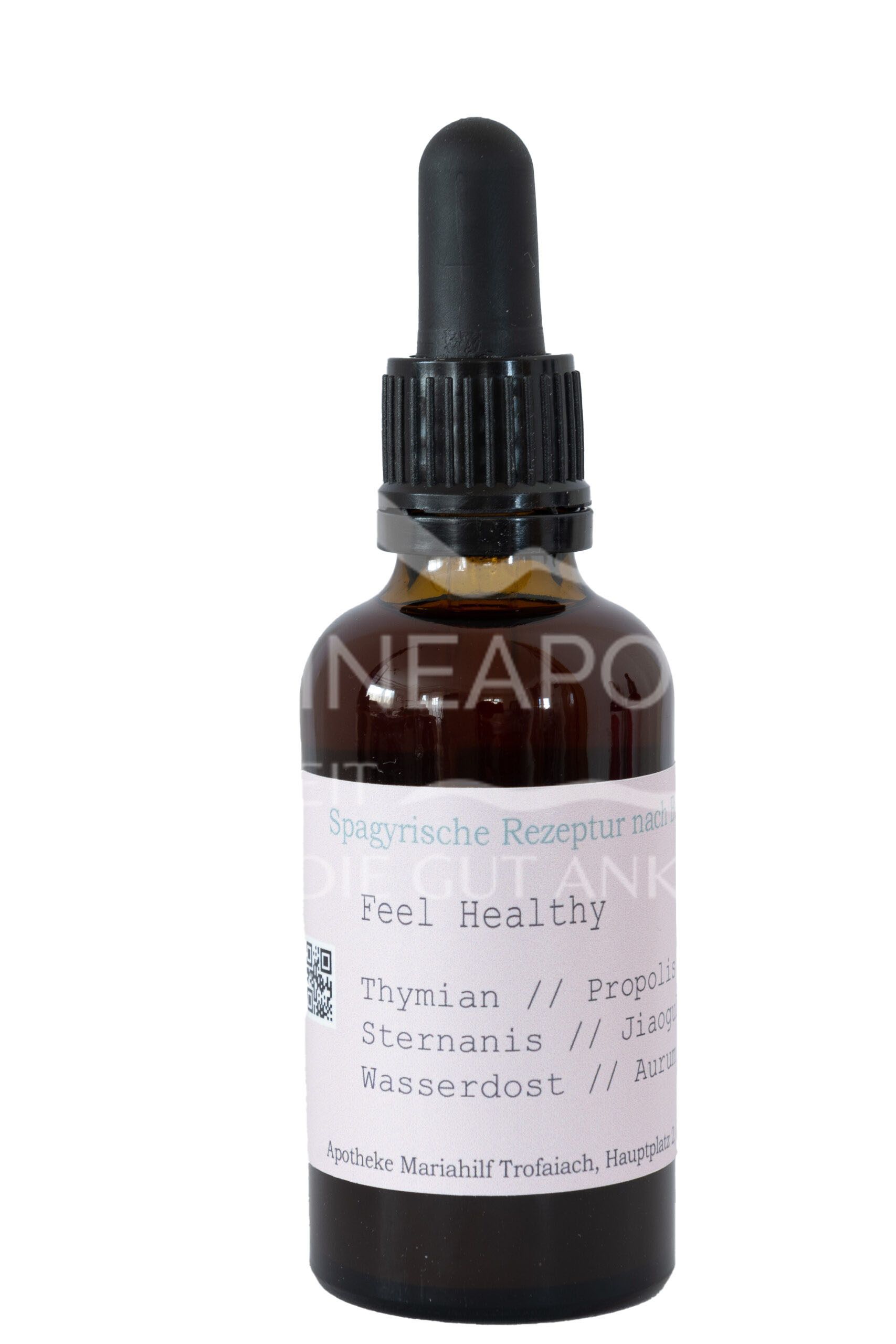 Das „Feel Healthy“ Elixier wird speziell nach einer spagyrischen Rezeptur von Katharina Maria Burkhardt mit Thymian, Propolis, Sternanis, Jiaogulan, Wasserdost und Aurum hergestellt.