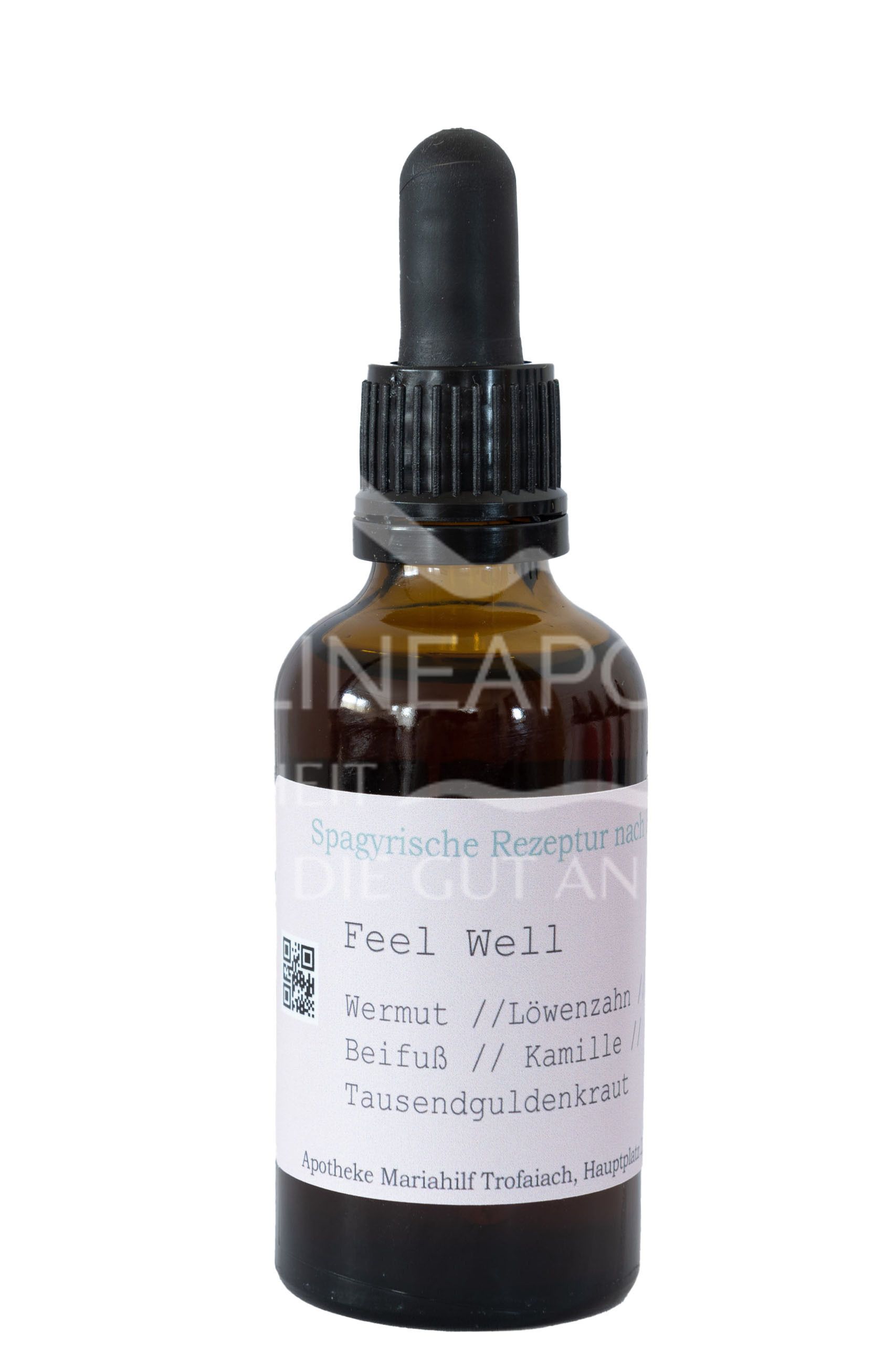 Das „Feel Well“ Elixier wird speziell nach einer spagyrischen Rezeptur von Katharina Maria Burkhardt mit Wermut, Löwenzahn, Beifuß, Kamille und Tausendgüldenkraut hergestellt.