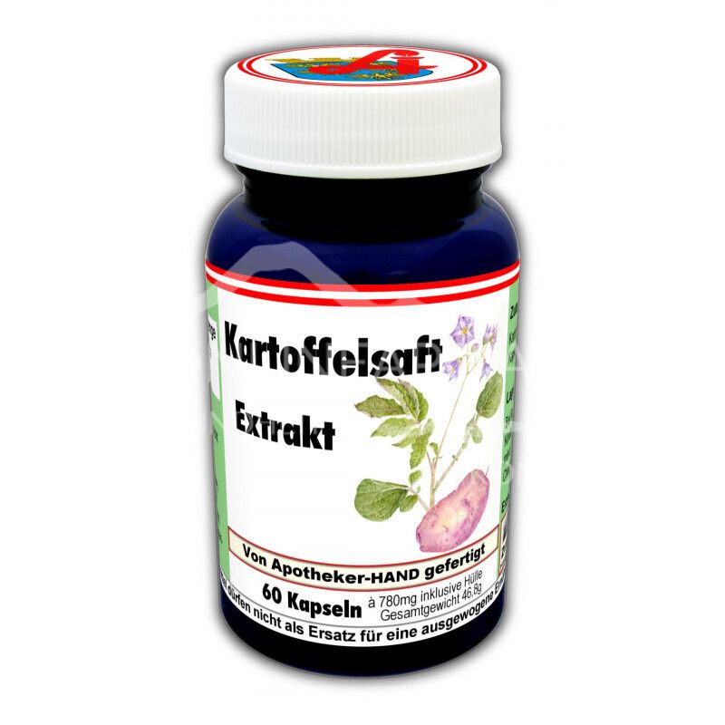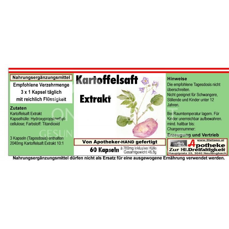 - Zusammensetzung pro Tagesdosis (3 Kapseln): 2040mg Kartoffelsaft Extrakt 10:1.