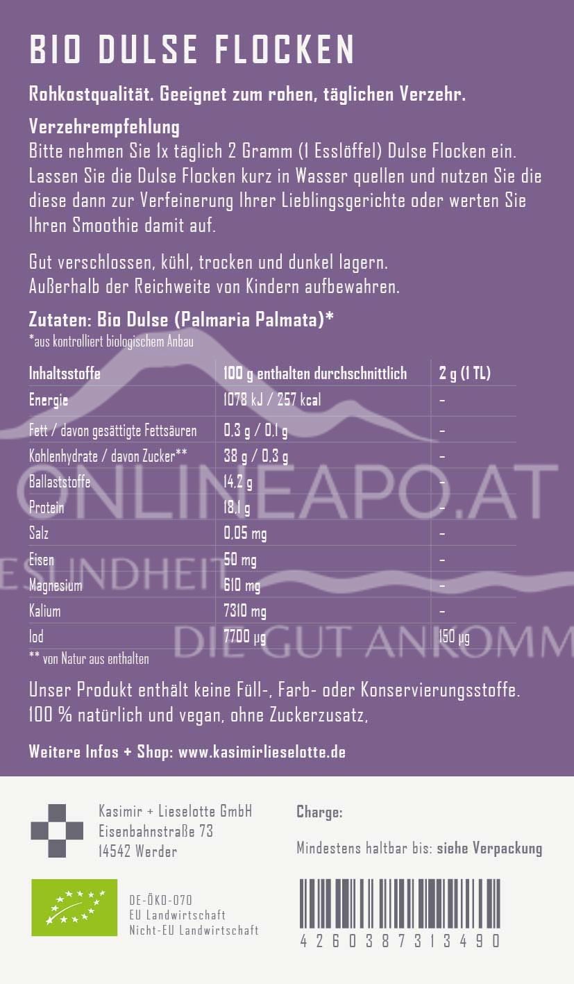 Kasimir + Lieselotte Bio Dulse Flocken ist ein Nahrungsergänzungsmittel mit hochwertigen Bio-Dulse Alge aus biozertifiziertem Anbau aus den klaren Gewässern des Nordatlantiks. 100 %natürlich, vegan, Rohkostqualität.