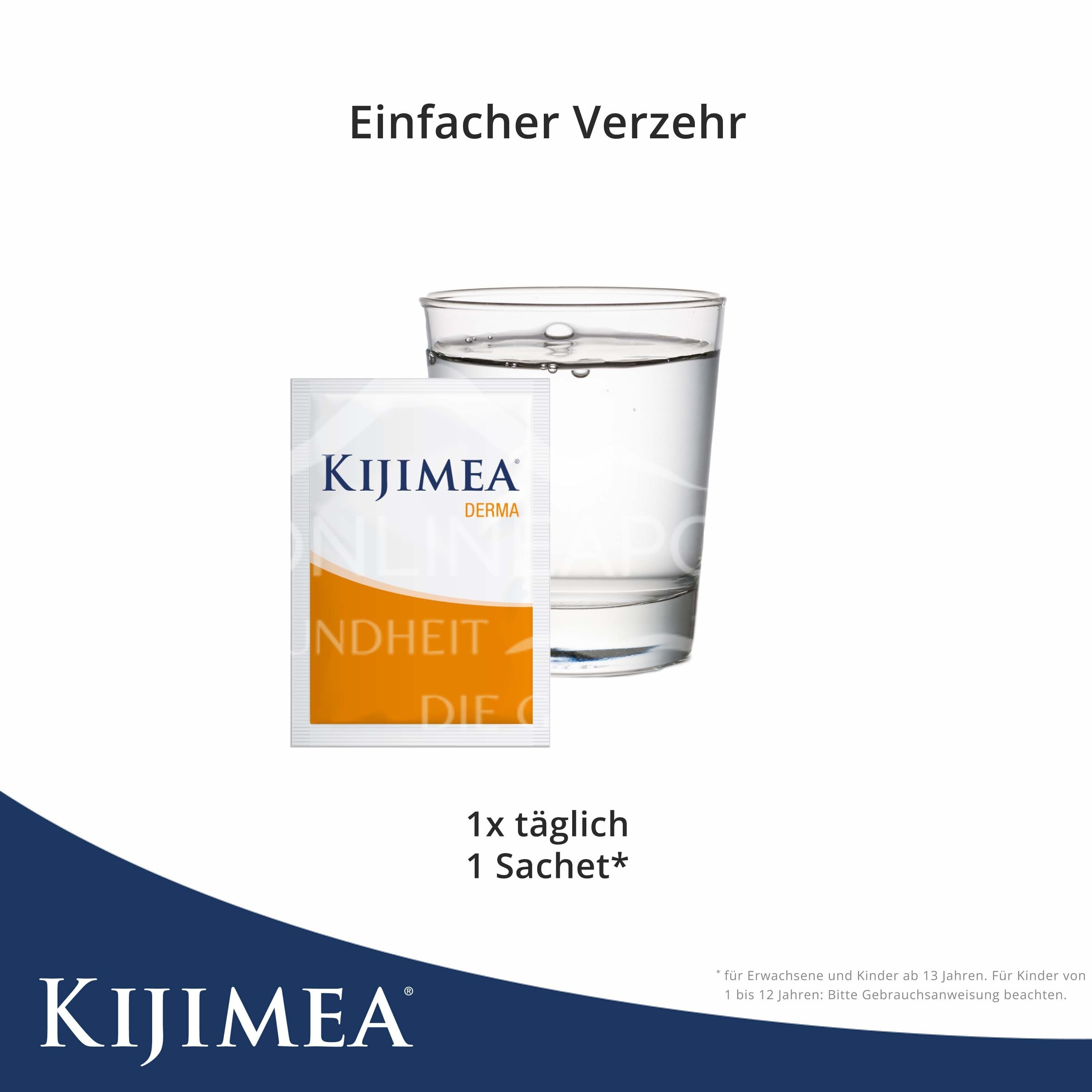 - Verzehren Sie täglich ein Sachet Kijimea® Derma zum Essen in kalte Flüssigkeit ohne Kohlensäure (z.B. Wasser, Saft, Joghurt) eingerührt.